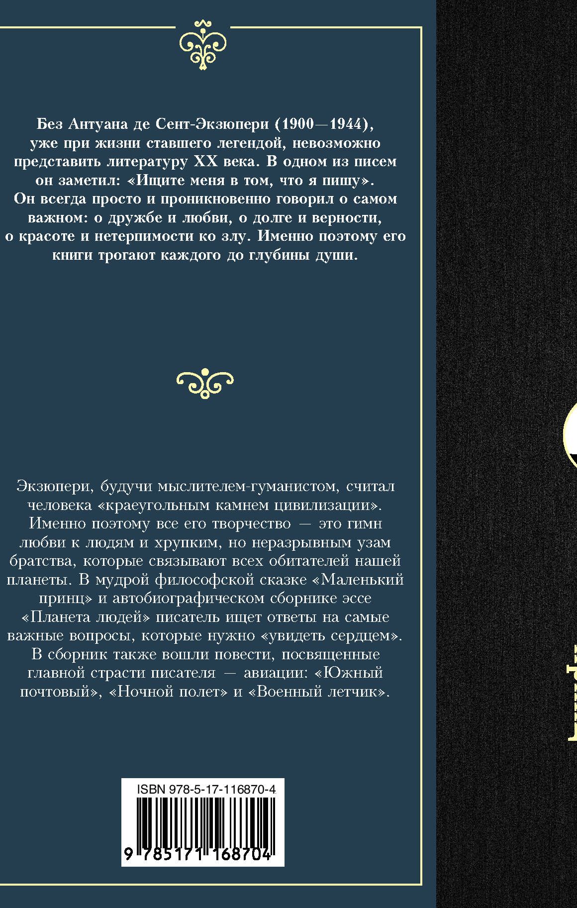 Без Антуана де Сент-Экзюпери (1900-1944), уже при жизни ставшего легендой, невозможно представить литературу ХХ века. В одном из писем он заметил: "Ищите меня в том, что я пишу". Он всегда просто и проникновенно говорил о самом важном: о дружбе и любви, о долге и верности, о красоте и нетерпимости ко злу. Именно поэтому его книги трогают каждого до глубины души.