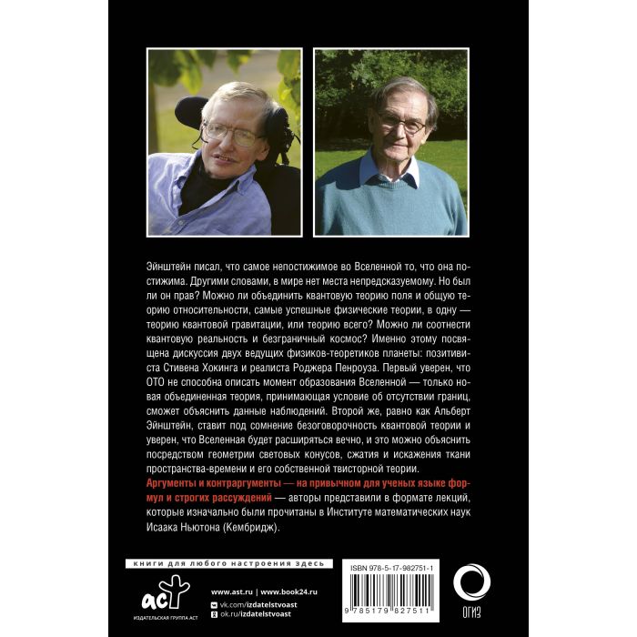 Эйнштейн писал, что самое непостижимое во Вселенной то, что она постижима. Другими словами, в мире нет места непредсказуемому. Но был ли он прав? Можно ли объединить квантовую теорию поля и общую теорию относительности, самые успешные физические теории, в одну — теорию квантовой гравитации, или теорию всего? Можно ли соотнести квантовую реальность и безграничный космос? Именно этому посвящена дискуссия двух ведущих физиков-теоретиков планеты: позитивиста Стивена Хокинга и реалиста Роджера Пенроуза. Первый уверен, что ОТО не способна описать момент образования Вселенной — только новая объединенная теория, принимающая условие об отсутствии границ, сможет объяснить данные наблюдений. Второй же, равно как Альберт Эйнштейн, ставит под сомнение безоговорочность квантовой теории и уверен, что Вселенная будет расширяться вечно, и это можно объяснить посредством геометрии световых конусов, сжатия и искажения ткани пространства-времени и его собственной твисторной теории. Аргументы и контраргументы — на привычном для ученых языке формул и строгих рассуждений — авторы представили в формате лекций, которые изначально были прочитаны в Институте математических наук Исаака Ньютона (Кембридж).