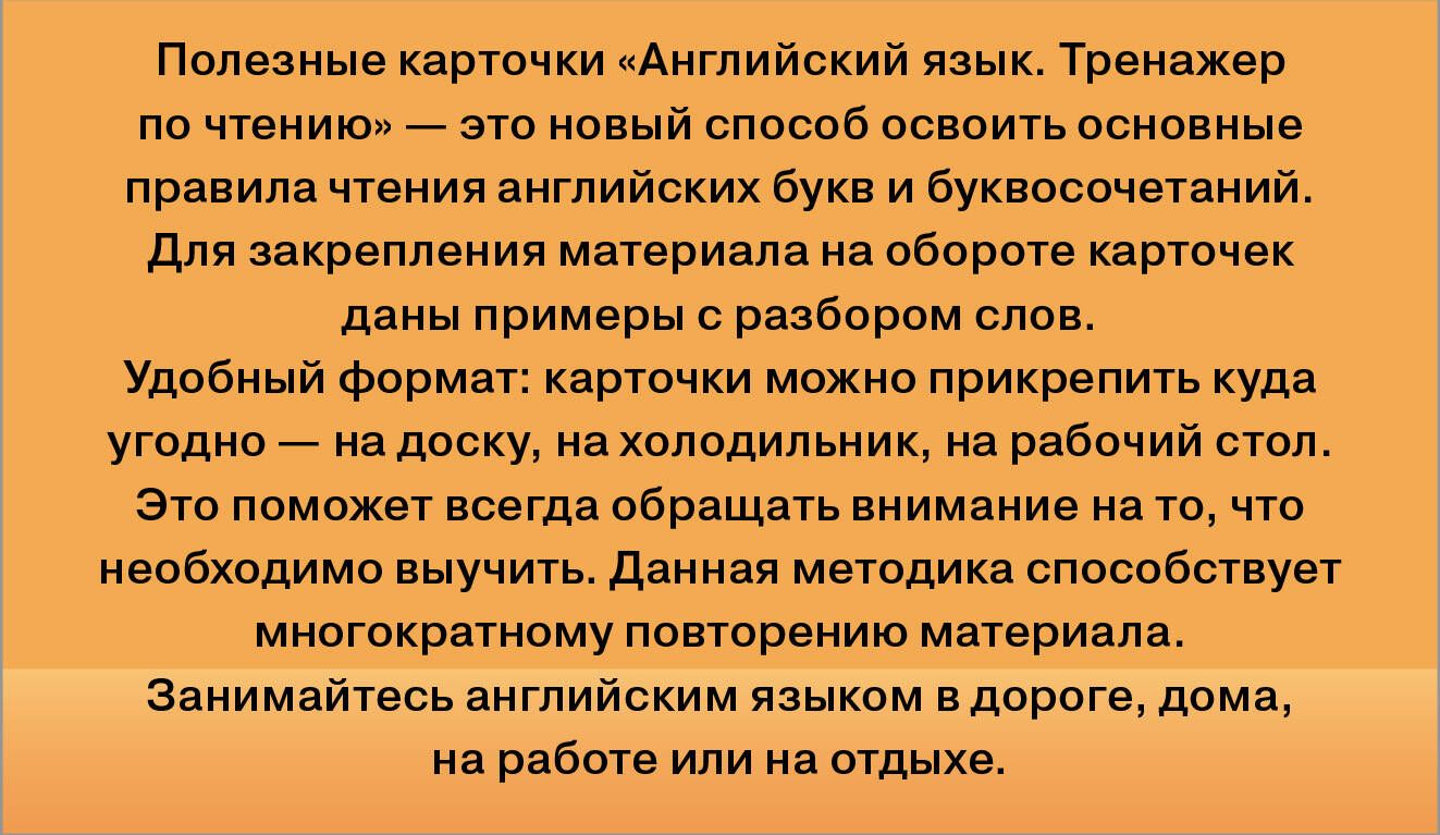 Полезные карточки "Английский язык. Тренажер по чтению" — это новый способ освоить основные правила чтения английских букв и буквосочетаний. Для закрепления материала на обороте карточек даны примеры с разбором слов. Удобный формат: карточки можно прикрепить куда угодно – на доску, на холодильник, на рабочий стол. Это поможет всегда обращать внимание на то, что необходимо выучить. Данная методика способствует многократному повторению материала. Занимайтесь английским языком в дороге, дома, на работе или на отдыхе.