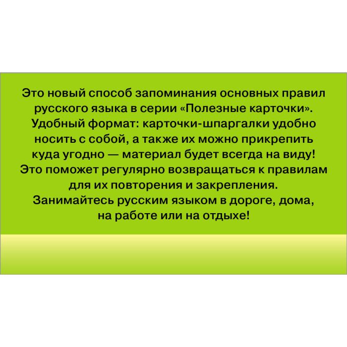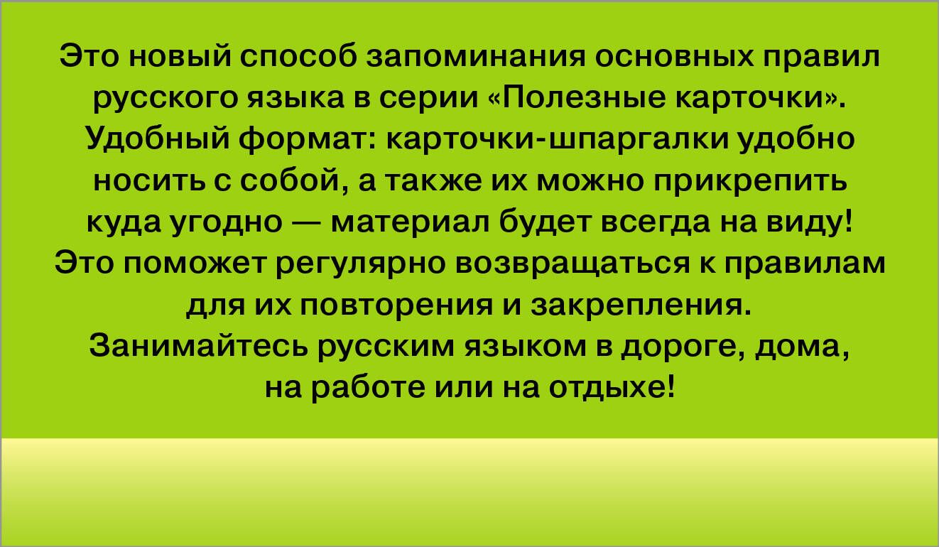 "Все правила русского языка" – это новый способ запоминания основных правил русского языка в серии "Полезные карточки". Удобный формат: карточки-шпаргалки удобно носить с собой, а также их можно прикрепить куда угодно - материал будет всегда на виду! Это поможет регулярно возвращаться к правилам для их повторения и закрепления. Занимайтесь русским языком в дороге, дома, на работе или на отдыхе!