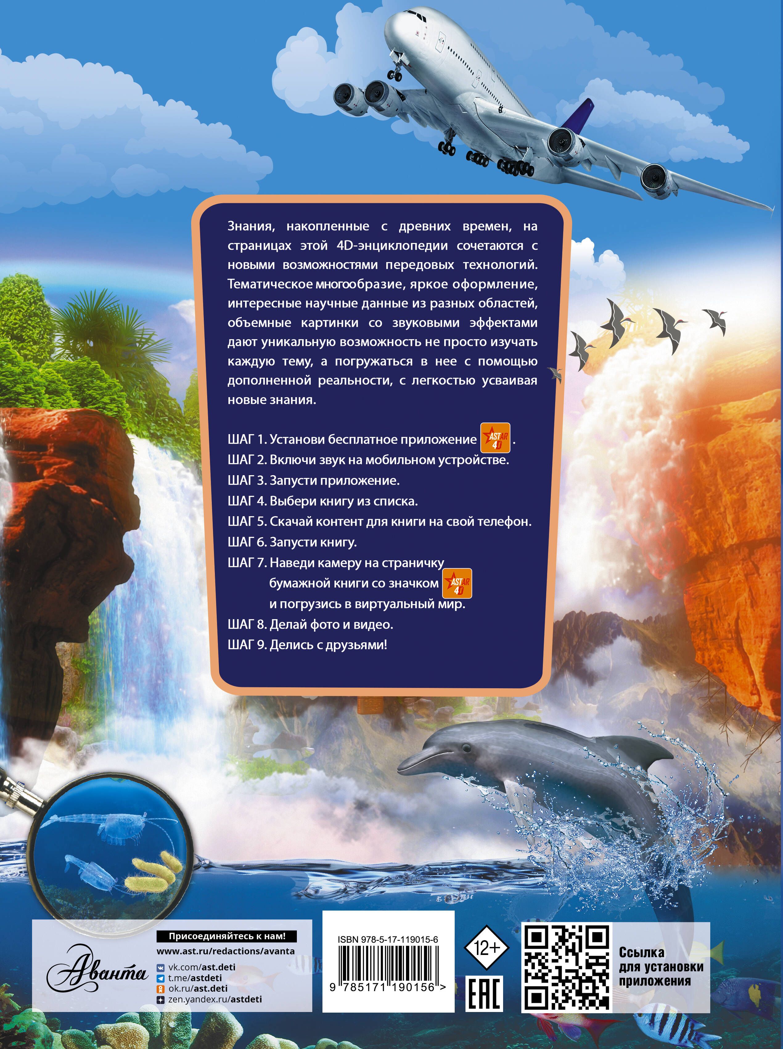 Эта развивающая 4D-энциклопедия с элементами дополненной реальности приводит разносторонние сведения из различных областей знаний, тем самым помогая глубже изучить окружающий мир в его многообразии. Образование Вселенной, зарождение жизни, эволюция и естественный отбор, возникновение человека, анатомия и физиология, технический прогресс и исследование космоса — яркий рассказ обо всем этом впечатляет и вызывает желание провести собственный научный эксперимент. И книга дает читателю такую возможность: здесь имеются описание и анимация несложных, но полезных познавательных опытов. А благодаря использованию технологий дополненной реальности иллюстрации на этих страницах можно изучить не только в цвете, но и в объеме, движении и со звуковыми эффектами. Издание расширяет кругозор и помогает лучше познать мир, в котором мы живем. Для среднего и старшего школьного возраста.