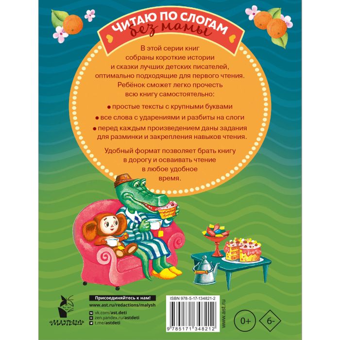 Книги серии "Читаю без мамы по слогам" адресованы дошкольникам для закрепления слогового чтения и перехода к чтению целыми словами. Для первого чтения детям предлагаются короткие простые рассказы и сказки классиков детской литературы. В сборнике "Короткие истории для первого чтения" собраны маленькие рассказы Эдуарда Успенского о приключениях Гены и Чебурашки. Издание дополнено игровыми заданиями на закрепление навыков чтения. Для дошкольного возраста.