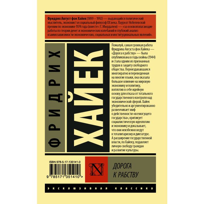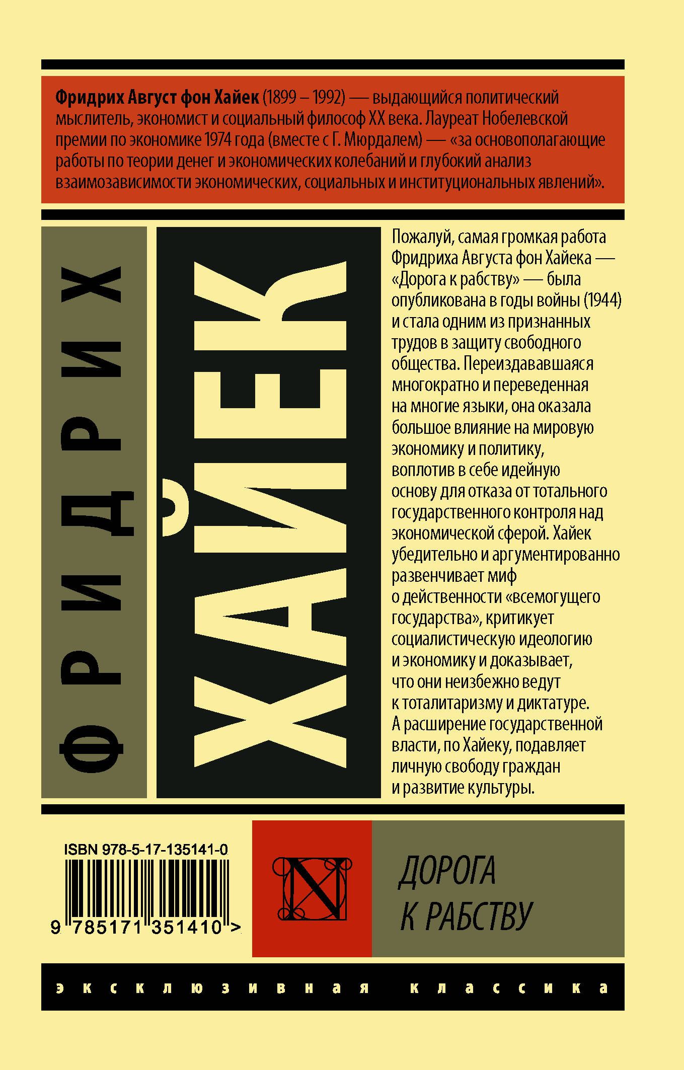 Пожалуй, самая громкая работа Фридриха Августа фон Хайека — "Дорога к рабству" — была опубликована в годы войны (1944) и стала одним из признанных трудов в защиту свободного общества. Многократно переиздававшая и переведенная на многие языки, она оказала большое влияние на мировую экономику и политику, воплотив в себе идейную основу для отказа от тотального государственного контроля над экономической сферой. Хайек убедительно и аргументированно развенчивает миф о действенности "всемогущего государства", критикует социалистическую идеологию и экономику и доказывает, что они неизбежно ведут к тоталитаризму и диктатуре. А расширение государственной власти, по Хайеку, подавляет личную свободу граждан и развитие культуры.