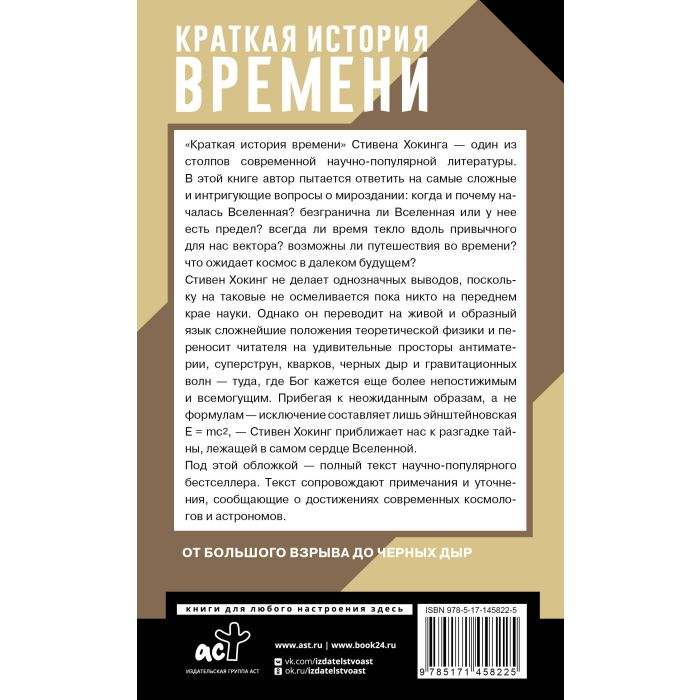 "Краткая история времени" Стивена Хокинга — один из столпов современной научно-популярной литературы. В этой книге автор пытается ответить на самые сложные и интригующие вопросы о мироздании: когда и почему началась Вселенная? безгранична ли Вселенная или у нее есть предел? всегда ли время текло вдоль привычного для нас вектора? возможны ли путешествия во времени? что ожидает космос в далеком будущем? Стивен Хокинг не делает однозначных выводов, поскольку на таковые не осмеливается пока никто на переднем крае науки. Однако он переводит на живой и образный язык сложнейшие положения теоретической физики и переносит читателя на удивительные просторы антиматерии, суперструн, кварков, черных дыр и гравитационных волн — туда, где Бог кажется еще более непостижимым и всемогущим. Прибегая к неожиданным образам, а не формулам — исключение составляет лишь эйнштейновская Е = mc2, — Стивен Хокинг приближает нас к разгадке тайны, лежащей в самом сердце Вселенной. Под этой обложкой — полный текст научно-популярного бестселлера. Текст сопровождают примечания и уточнения, сообщающие о достижениях современных космологов и астрономов.