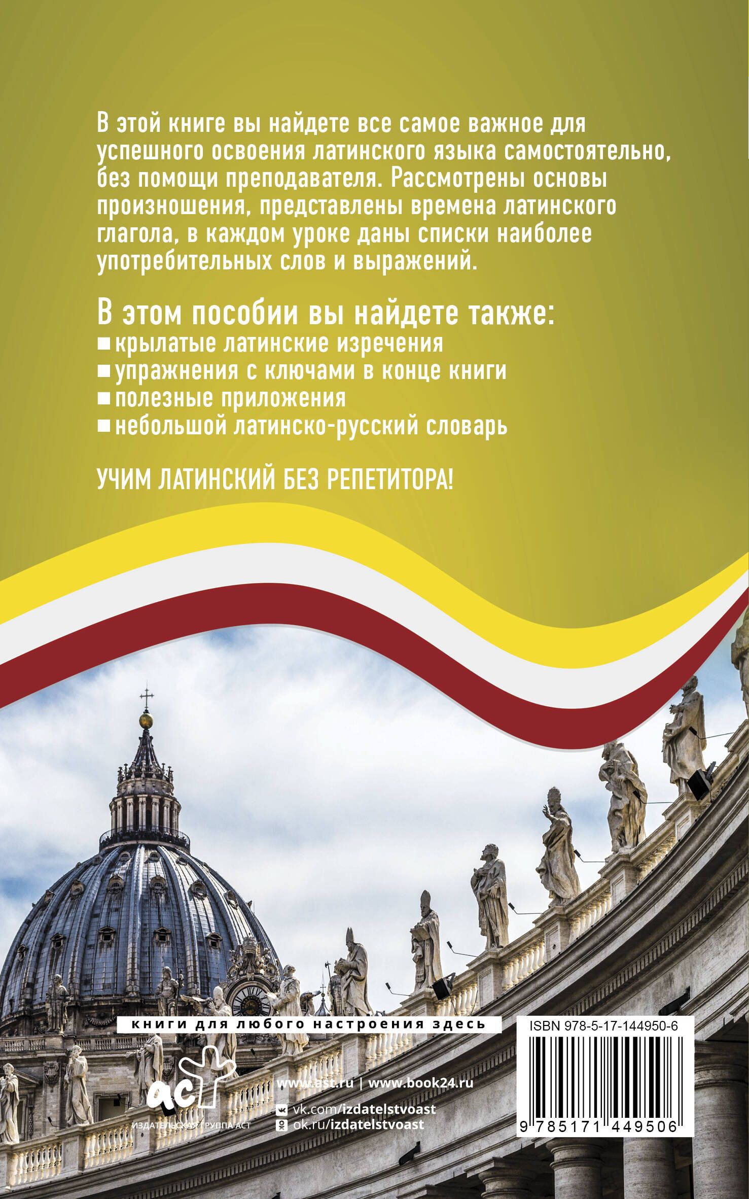 Данный самоучитель поможет читателям самостоятельно без помощи преподавателя овладеть азами латинского языка. В этой книге вы найдете правила чтения и произношения, самые нужные грамматические темы, а также узнаете основные латинские времена. Материал в пособии изложен максимально понятно и доступно, хорошо запоминается благодаря большому количеству примеров с широкоупотребительной лексикой. К каждому уроку дается словарик с новыми и полезными словами, также приводятся крылатые латинские изречения.