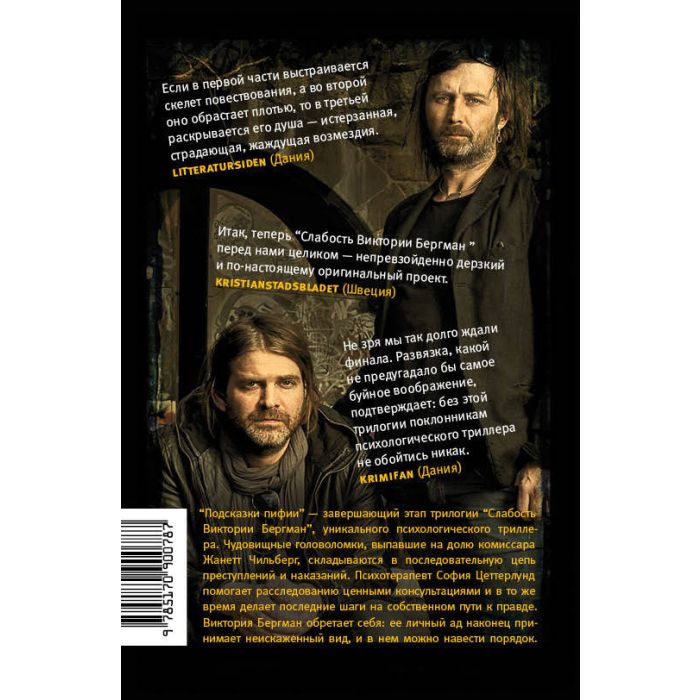 В последнем романе трилогии “Слабость Виктории Бергман” элементы беспрецедентной головоломки встают на свои места. Комиссар стокгольмской полиции Жа- нетт Чильберг доводит свои расследования до логического предела. В этом ей немало помогают советы подруги и любовницы, психотерапевта Софии Цеттерлунд. София осторожно направляет полицию по следу людей, изуродовавших ее детство, ее личность и ее дочь, а сама тем временем заканчивает собственную работу, цель которой —возвращение Виктории Бергман. Однако историю эту завершают не они. История сама уползает туда, где началась более полувека назад, и растворяется в породившем ее ужасе.