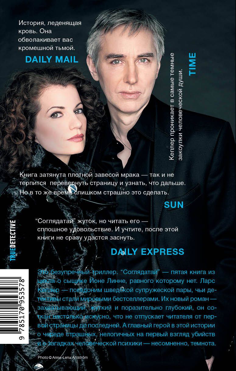 “Соглядатай” — пятый роман из цикла о сыщике Йоне Линне. Ларс Кеплер (псевдоним супругов Андорил) предлагает читателям очередной образец безупречного триллера. Полиция получает ссылку на короткий видеоклип: кто-то тайком снимал через окно женщину. Наутро ее обнаружили мертвой. Вскоре приходит еще один клип — с новой жертвой. А затем еще один, за считанные минуты до расправы. Полиции никак не удается напасть на след убийцы, который действует с крайней жестокостью: у всех жертв лица изрезаны ножом, словно преступник хотел стереть их. Остановить череду страшных, нелогичных на первый взгляд убийств взялась комиссар Марго Сильверман, это ее первое самостоятельное расследование. Следствие зашло бы в тупик — не вмешайся Йона Линна, которого все считали погибшим. Странным образом в дело замешан психиатр Эрик Мария Барк: ему достается весьма неожиданная роль в этой мрачной истории.