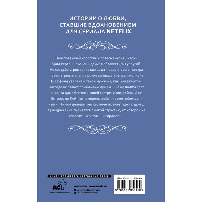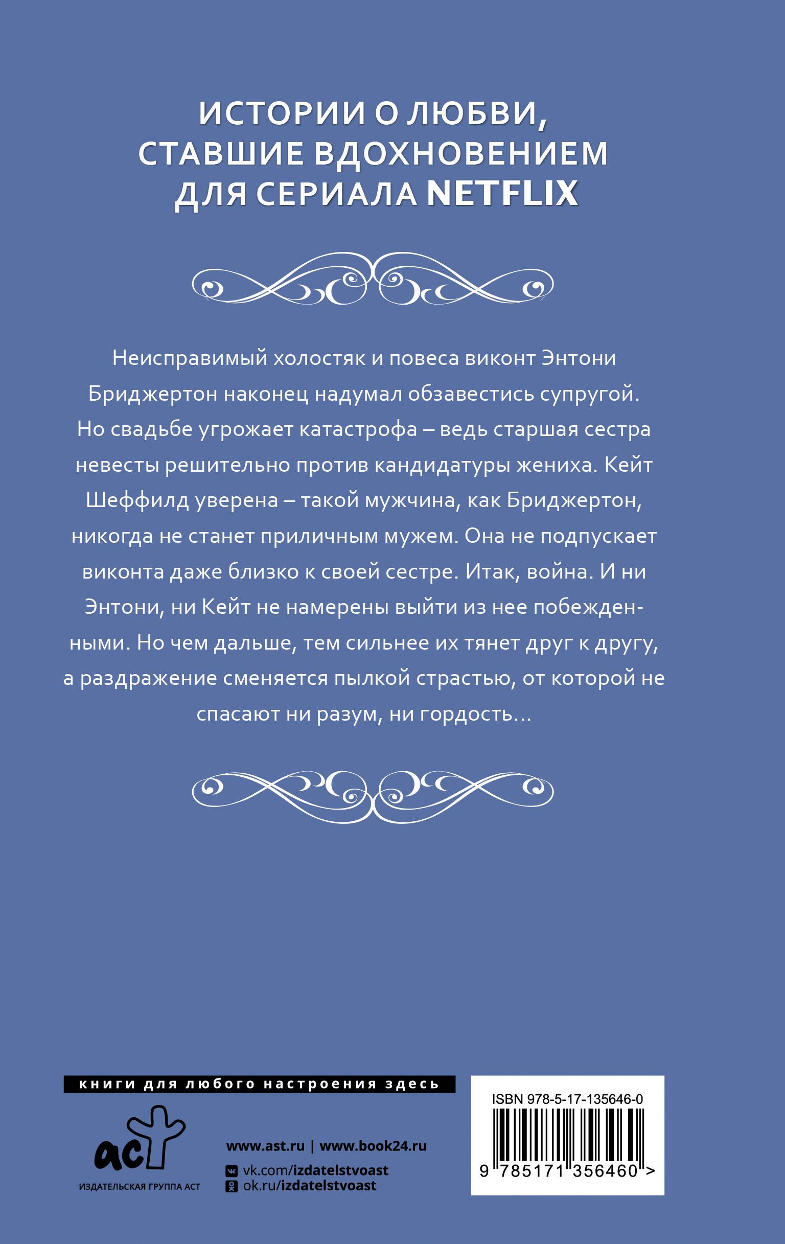 Неисправимый холостяк и повеса виконт Энтони Бриджертон наконец надумал обзавестись супругой. Но свадьбе угрожает катастрофа – ведь старшая сестра невесты решительно против кандидатуры жениха. Кейт Шеффилд уверена – такой мужчина, как Бриджертон, никогда не станет приличным мужем. Она не подпускает виконта даже близко к своей сестре. Итак, война. И ни Энтони, ни Кейт не намерены выйти из нее побежденными. Но чем дальше, тем сильнее их тянет друг к другу, а раздражение сменяется пылкой страстью, от которой не спасают ни разум, ни гордость...