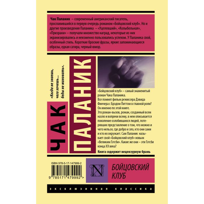 "Бойцовский клуб" – самый знаменитый роман Чака Паланика. Все помнят фильм режиссера Дэвида Финчера с Брэдом Питтом в главной роли? Он именно по этой книге. Это роман-вызов, роман, созданный всем назло и вопреки всему, в нем описывается поколение озлобившихся людей, потерявших представление о том, что можно и чего нельзя, где добро и зло, кто они сами и кто их окружает. Сам Паланик называет свой "Бойцовский клуб" новым "Великим Гэтсби". Какие же они – эти Гэтсби конца XX века?