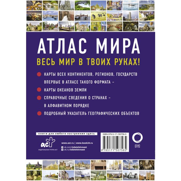 Атлас - обзорное справочное издание, в котором представлены современные карты всех материков, океанов, регионов и государств мира. Картографическая информация дополнена расположенными в алфавитном порядке краткими актуальными сведениями о каждой стране (площадь территории, количество населения, официальный язык, денежная единица, флаг, портрет главы государства). В атласе имеется подробный указатель географических названий.