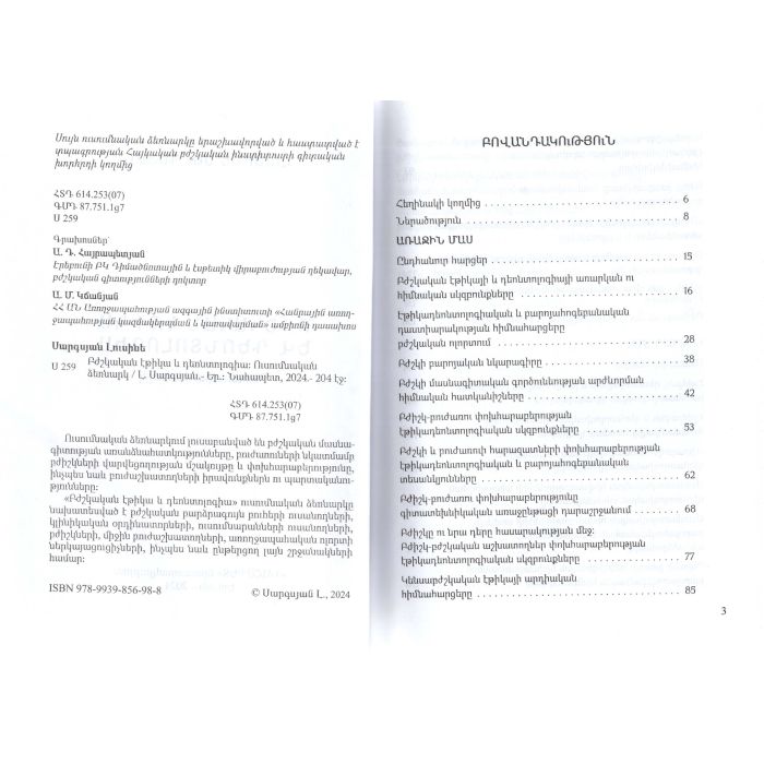 Ուսումնական ձեռնարկում լուսաբանված են բժշկական մասնագիտության առանձնահատկությունները, բուժառուների նկատմամբ բժիշկների վարվեցողության մշակույթը և փոխհարաբերությունը, ինչպես նաև բուժաշխատողների իրավունքներն ու պարտականությունները: