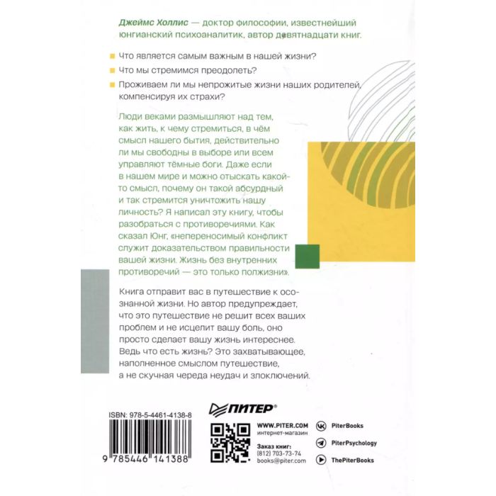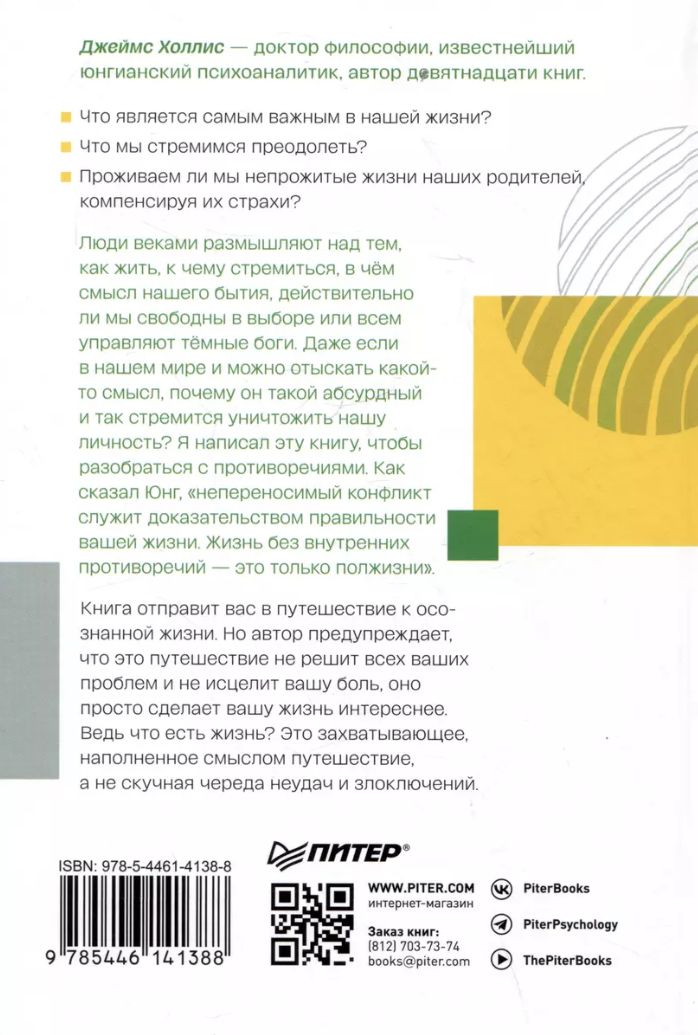 Но, к нашему стыду, мы ноем о тяжёлой жизни. Неужели жизнь действительно так трудна и несправедлива? Хорошая новость заключается в том, что мы можем выбирать, чего хотим больше: подниматься или падать? Развиваться или деградировать? Становиться сильнее или слабеть? Принимать жизнь или отстраняться от неё? Джеймс Холлис задает вопросы, заставляющие задуматься: что является насущным в нашей жизни? Что мы стремимся преодолеть? В каком мифе живем? Проживаем ли непрожитые жизни наших родителей, компенсируя их страхи? В какую игру превратилась наша жизнь, в служении чему или кому? Книга отправит вас в путешествие к познанию себя и осознанной жизни. Однако автор предупреждает, что это путешествие не решит всех ваших проблем и не исцелит вашу боль, но оно сделает вашу жизнь интереснее. Ведь жизнь - это захватывающее, наполненное смыслом путешествие, а не скучная череда неудач и злоключений.