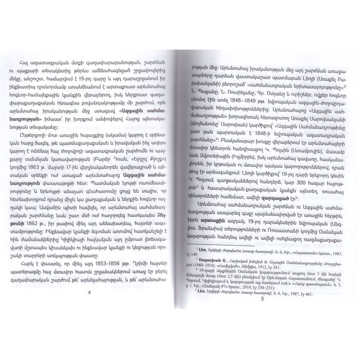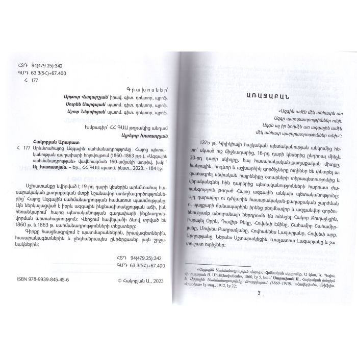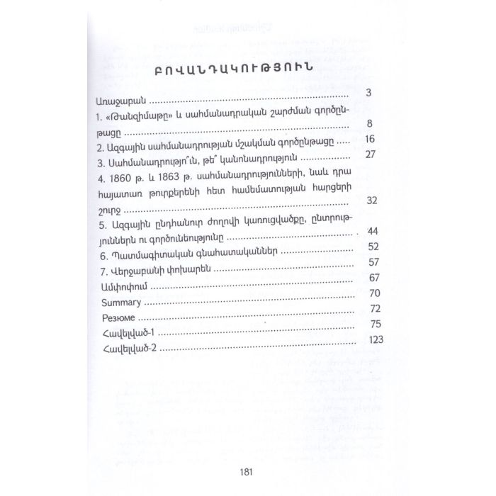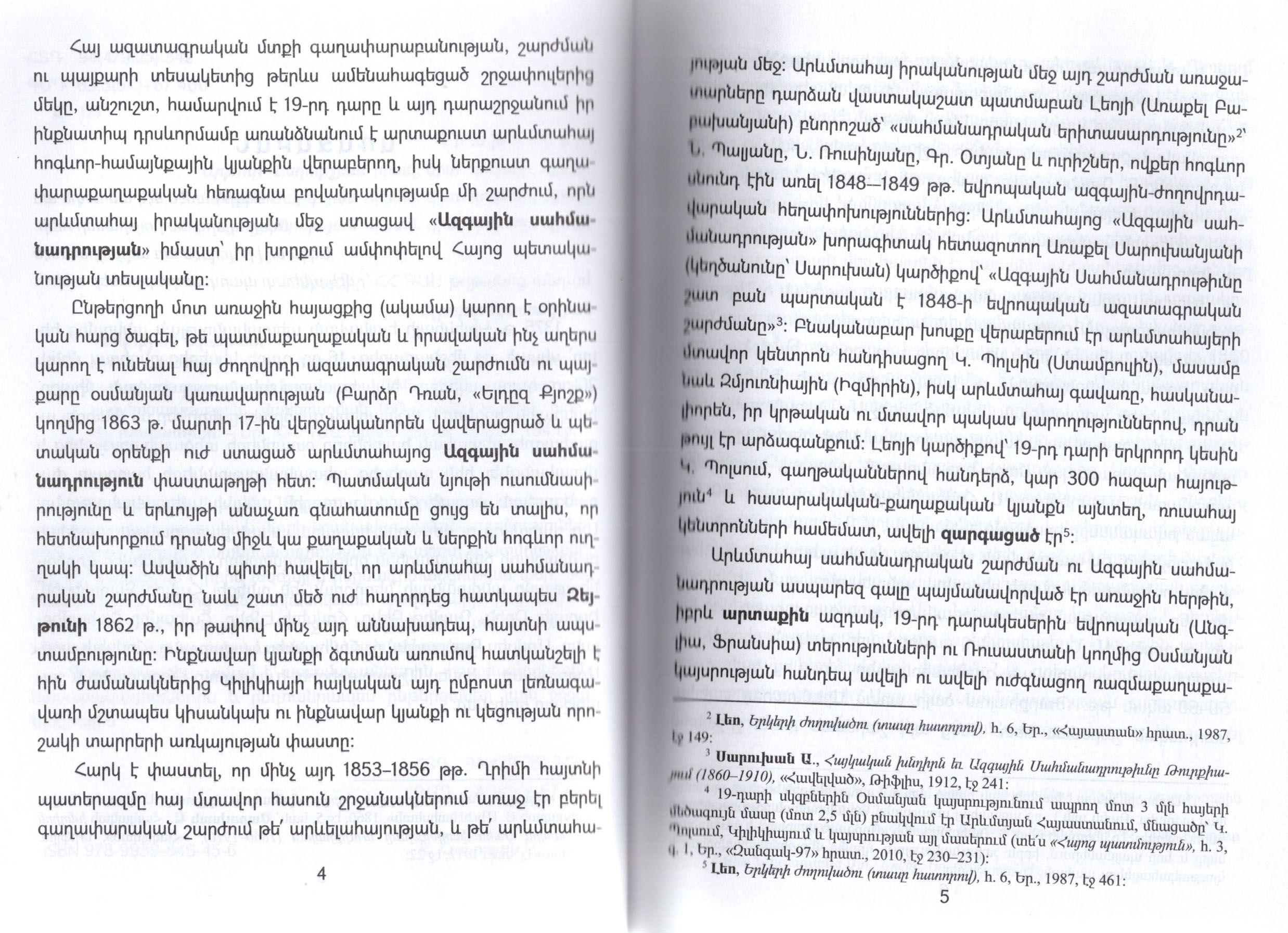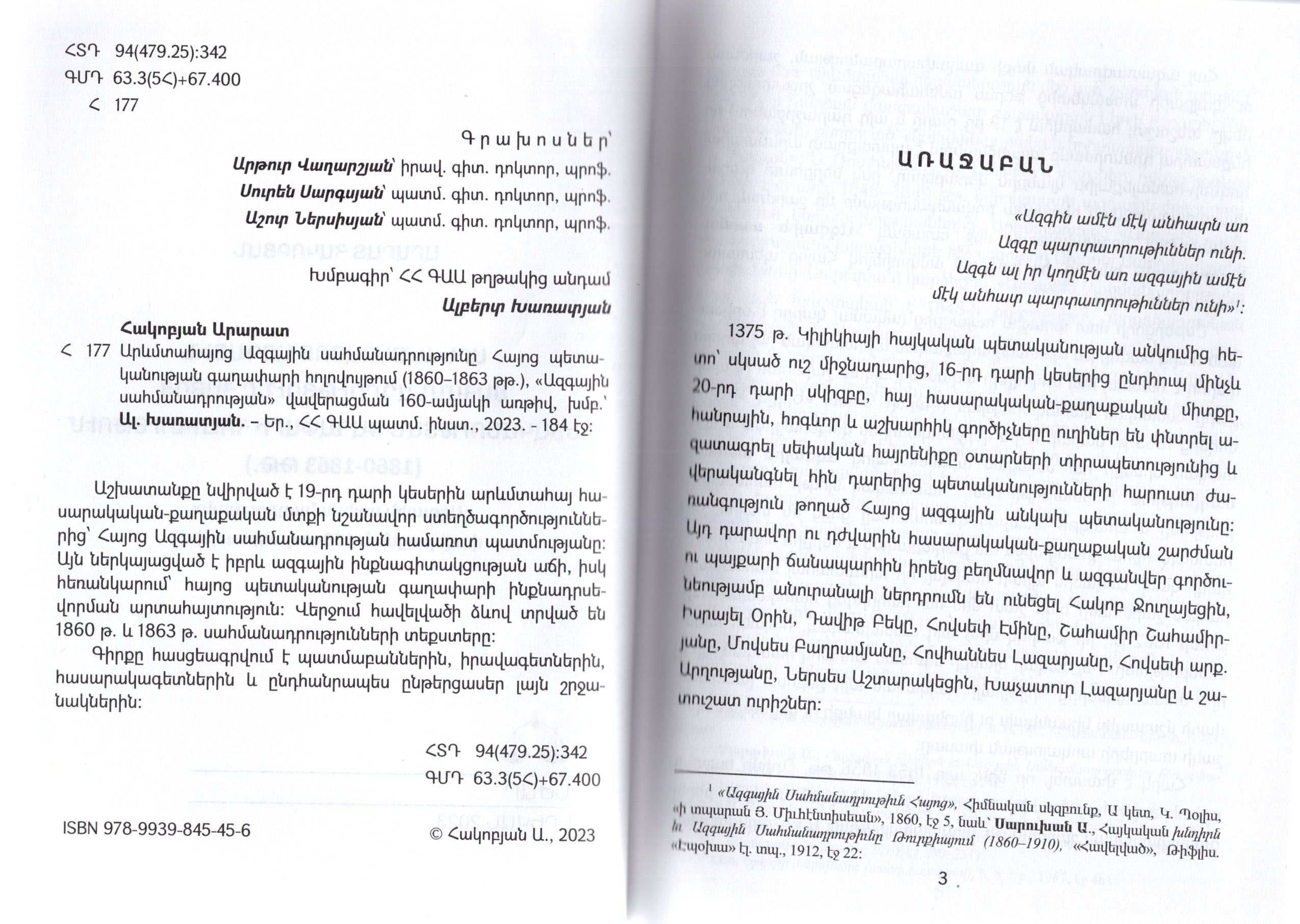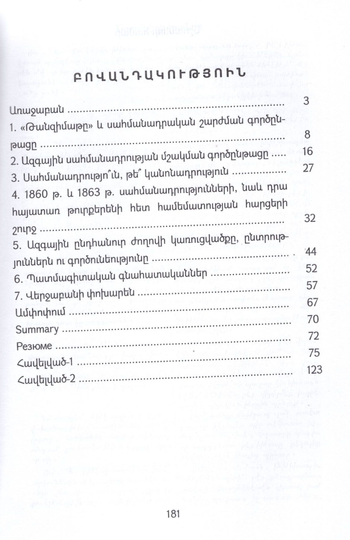Աշխատանքը նվիրված է 19-րդ դարի կեսերին արևմտահայ հասարակական-քաղաքական մտքի նշանավոր ստեղծագործություններից՝ Հայոց Ազգային սահմանադրության համառոտ պատմությանը: Այն ներկայացված է իբրև ազգային ինքնագիտակցության աճի, իսկ հեռանկարում՝ հայոց պետականության գաղափարի ինքնադրսևորման արտահայտություն: Վերջում հավելվածի ձևով տրված են 1860թ. և 1863թ. սահմանադրությունների տեքստերը: Գիրքը հասցեագրվում է պատմաբաններին, իրավագետներին, հասարակագետներին և ընդհանրապես ընթերցասեր լայն շրջանակներին: