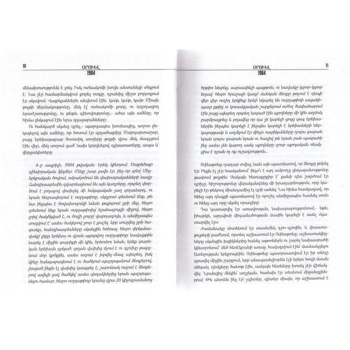 1949 թ. հրատարակված Ջորջ Օրուելի «1984» հանրահայտ վեպը նախկին ԽՍՀՄ տարածքում առաջին անգամ լույս տեսավ այն 1988 թ.։ Տարբեր ժամանակներում տարբեր երկրներում վեպը պարբե րաբար արգելվել է՝ երբեք ծիծաղելի պատճա ռաբա նու թյուններով։ Հայերեն լույս է տեսնում առաջին անգամ։
