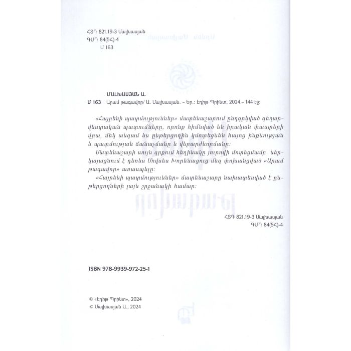 «Հայրենի պատմություններ» մատենաշարում ընդգրկված գեղարվեստական պատումները, որոնք հիմնված են իրական փաստերի վրա, մեկ անգամ ևս ընթերցողին կմոտեցնեն հայոց ինքնության և պատմության ճանաչմանը և վերարժևորմանը: