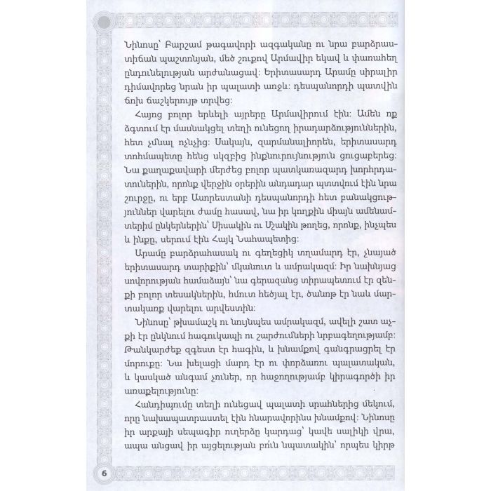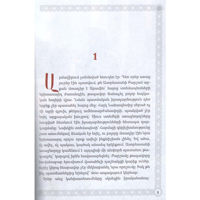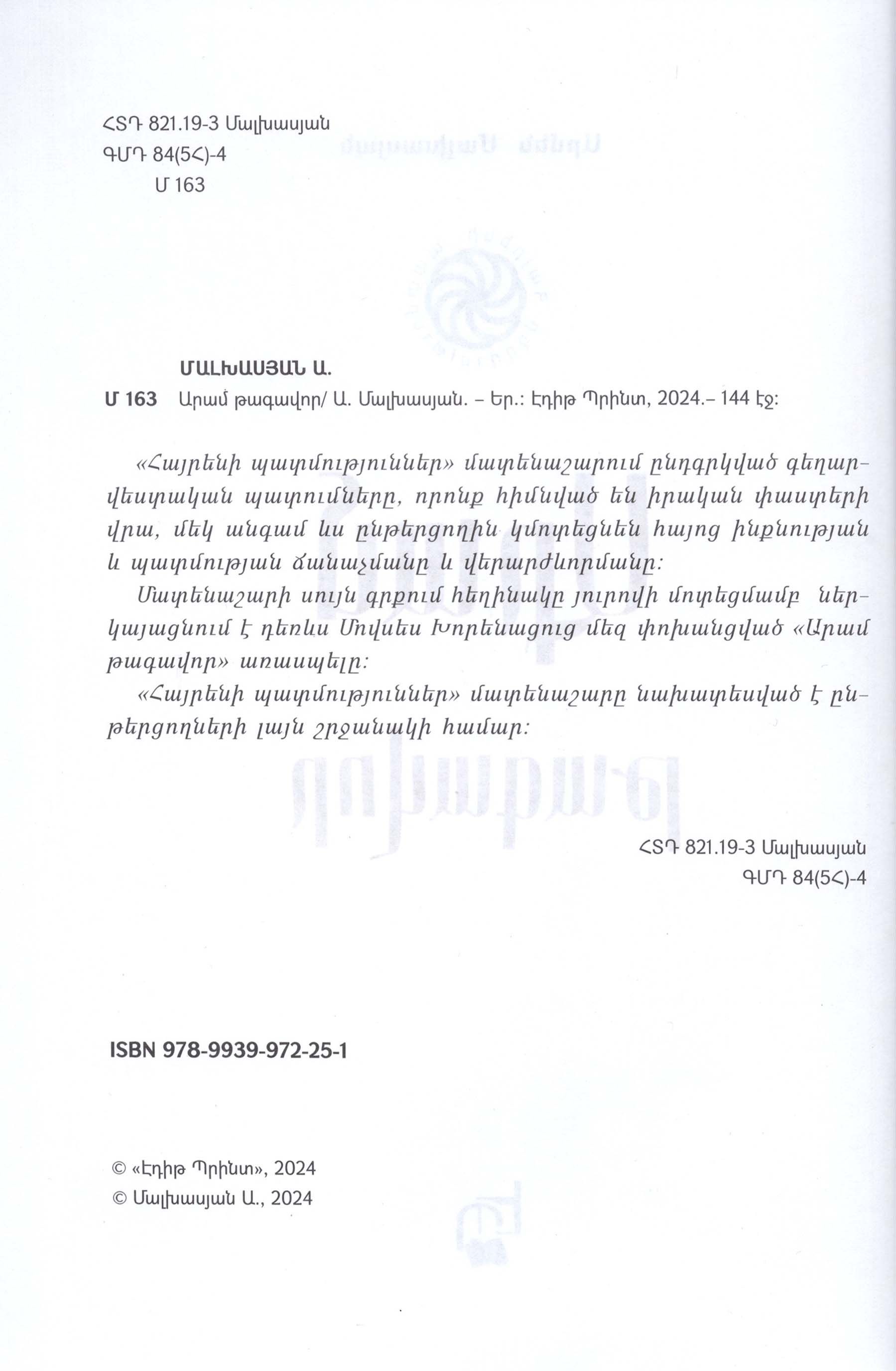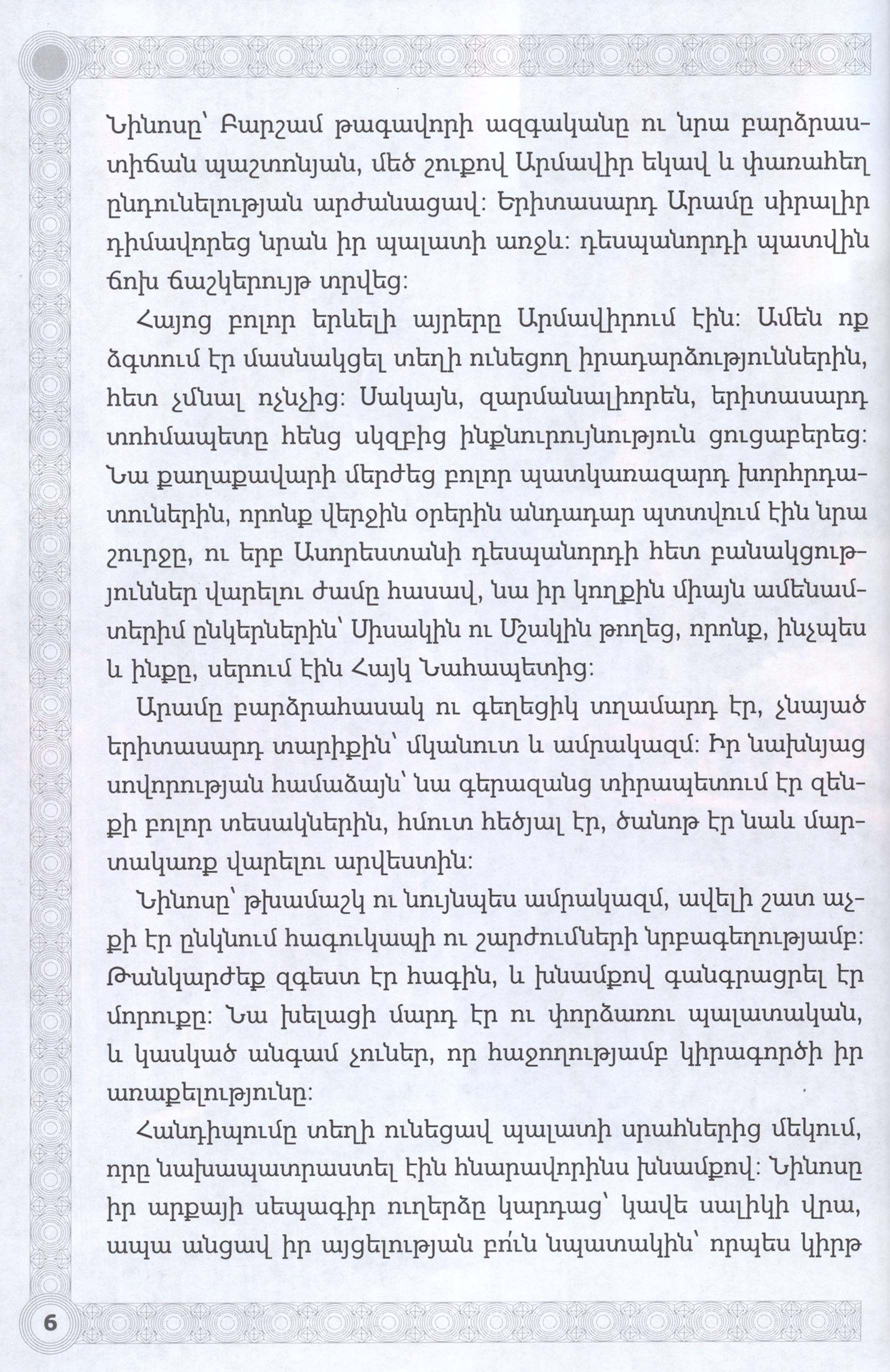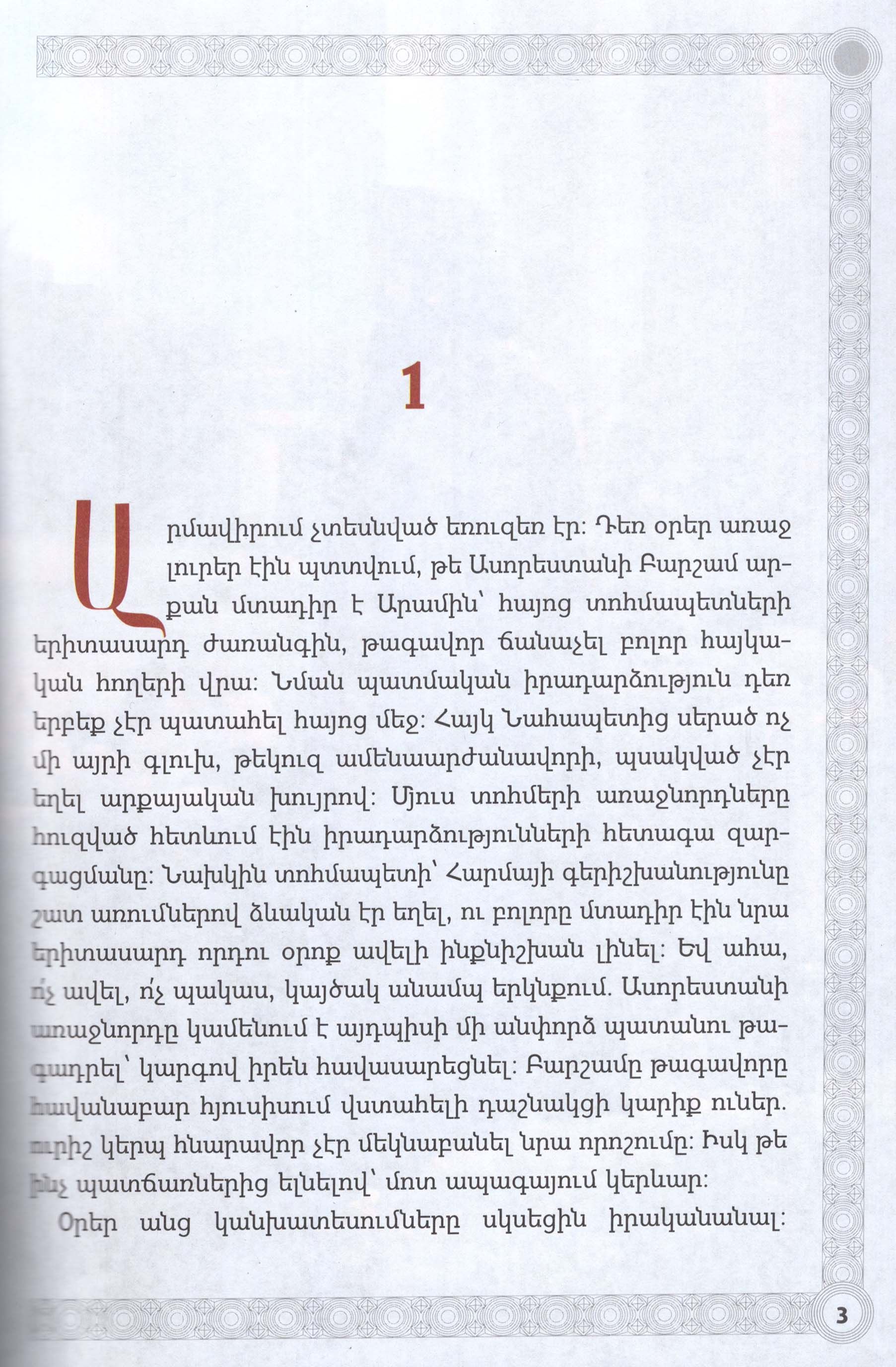 Մատենաշարի սույն գրքում հեղինակը յուրովի մոտեցմամբ ներկայացնում է դեռևս Մովսես Խորենացուց մեզ փոխանցված «Արամ թագավոր» առասպելը: