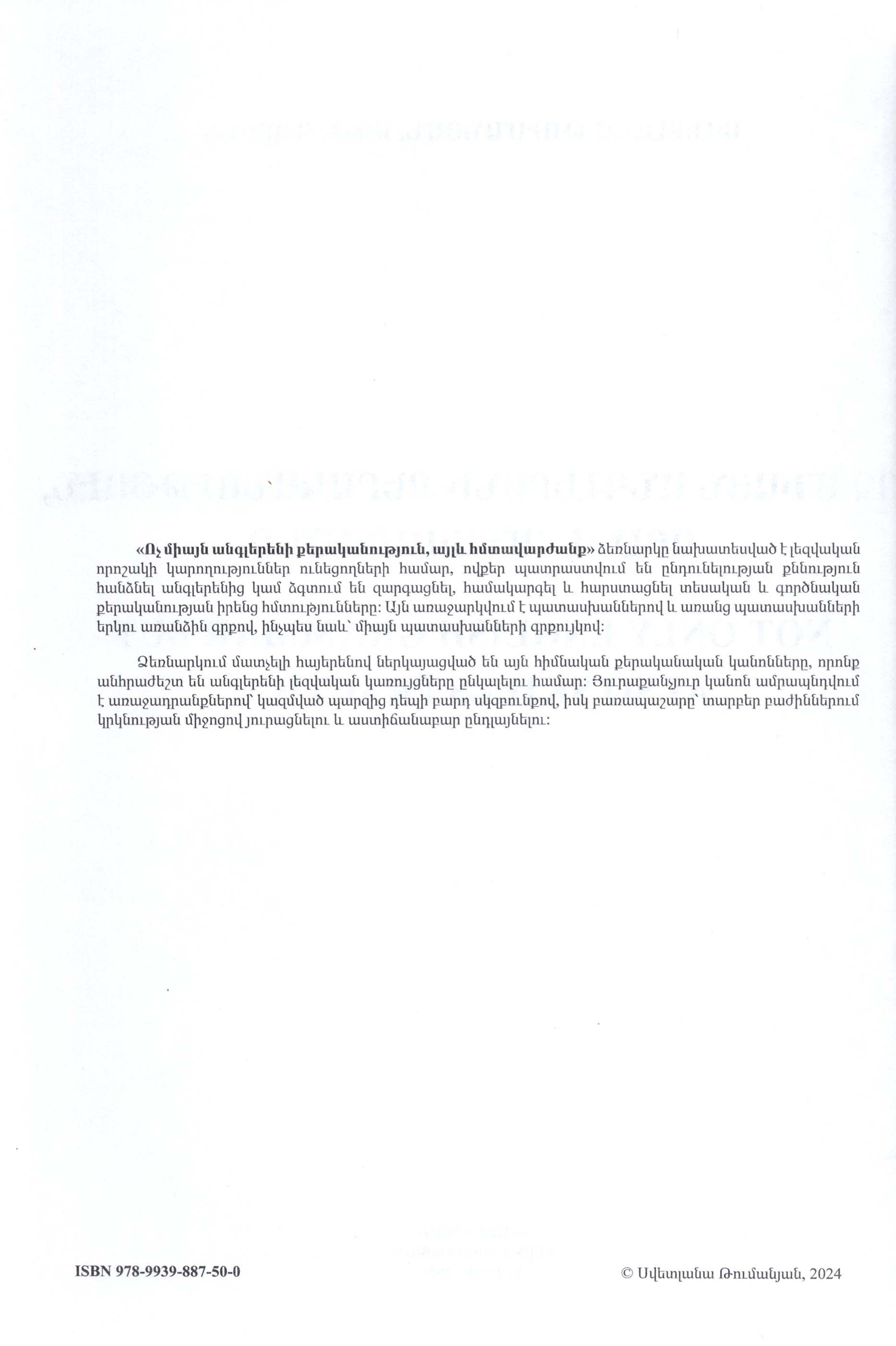 «Ոչ միայն անգլերենի քերականություն, այլև հմտավարժանք» ձեռնարկը նախատեսված է լեզվական որոշակի կարողություններ ունեցողների համար, ովքեր պատրաստվում են ընդունելության քննություն հանձնել անգլերենից կամ ձգտում են զարգացնել, համակարգել և հարստացնել տեսական և գործնական քերականության իրենց հմտությունները: Այն առաջարկվում է պատասխաններով և առանց պատասխանների երկու առանձին գրքով, ինչպես նաև՝ միայն պատասխանների գրքույկով: