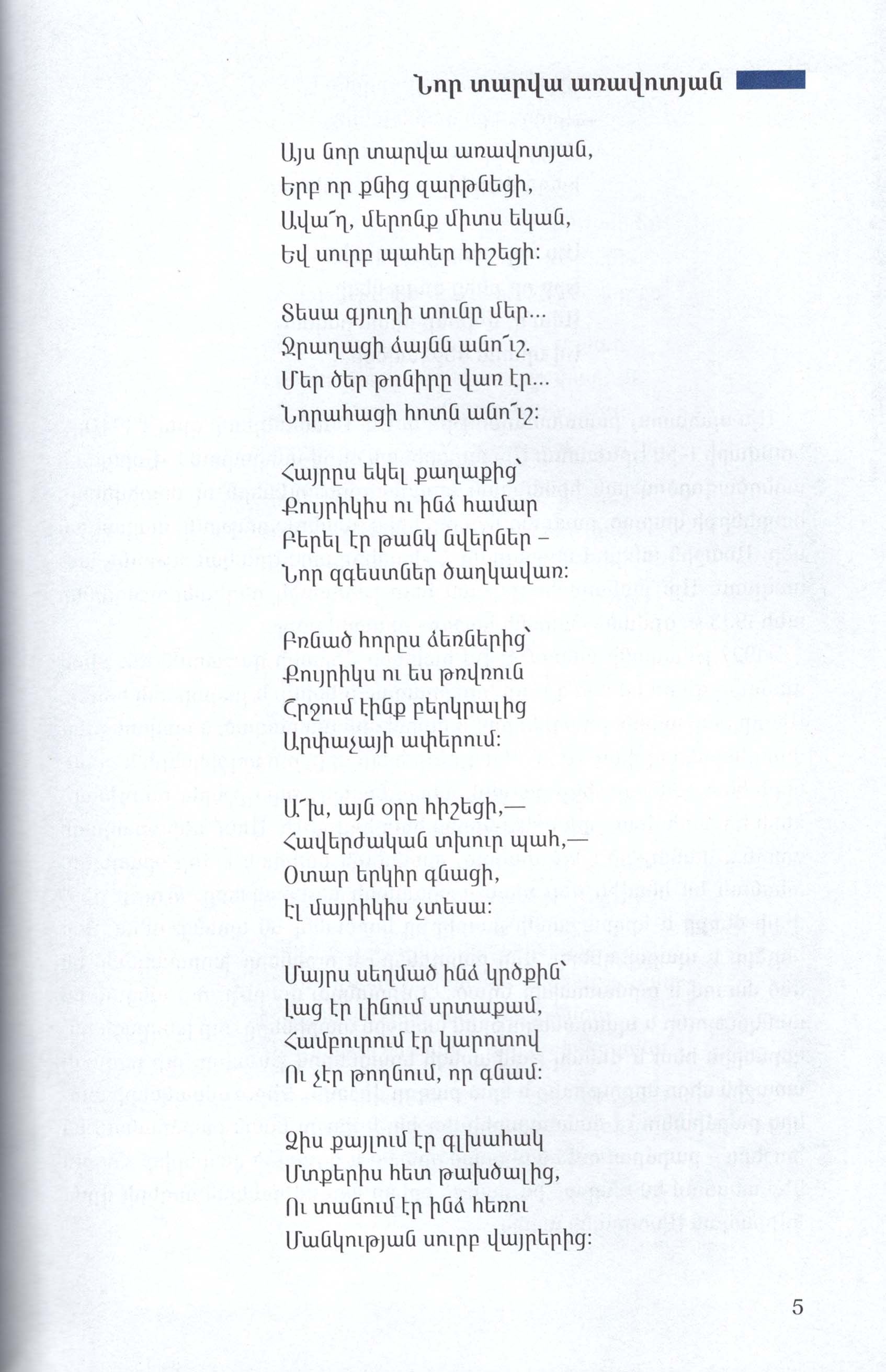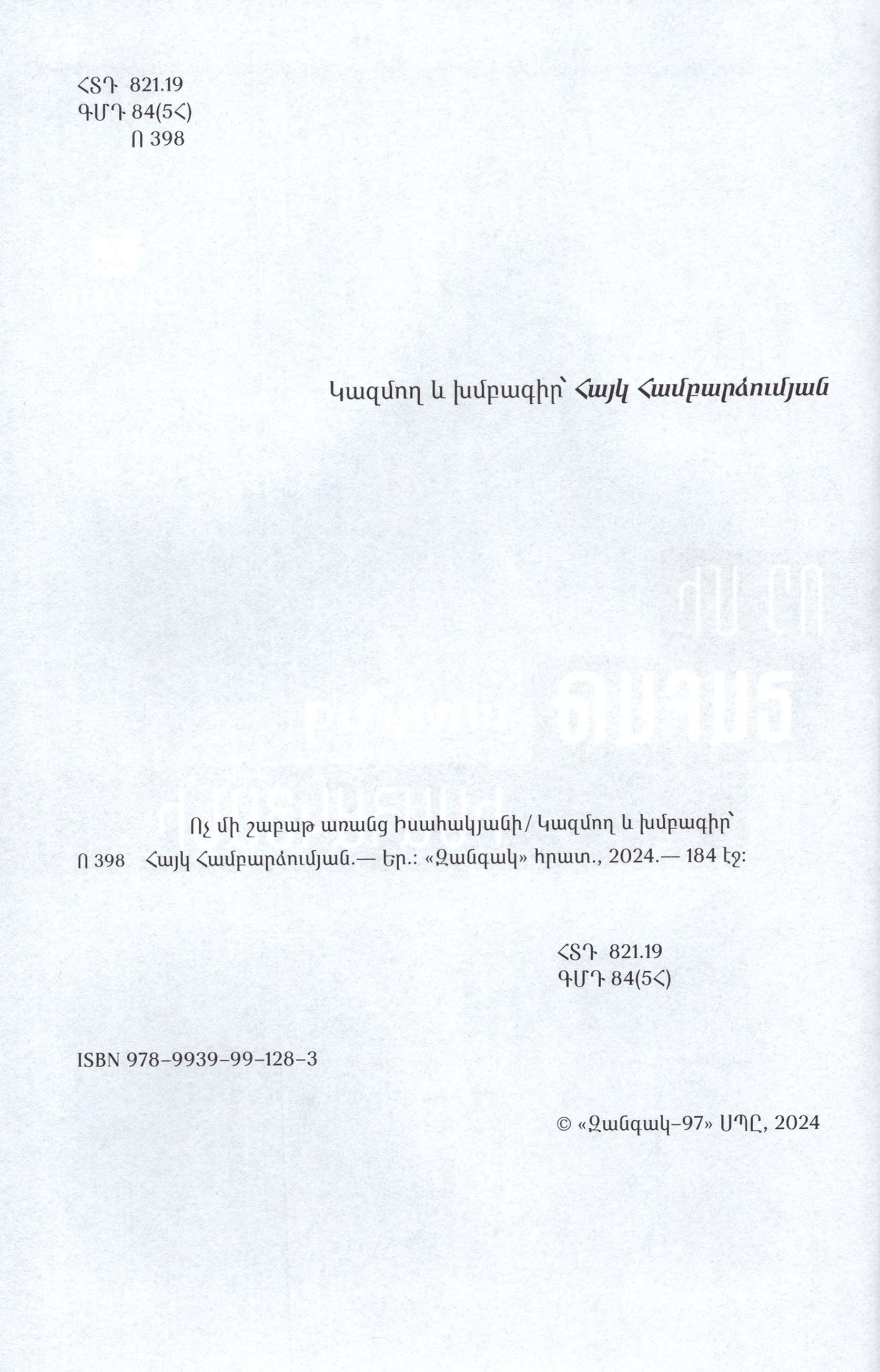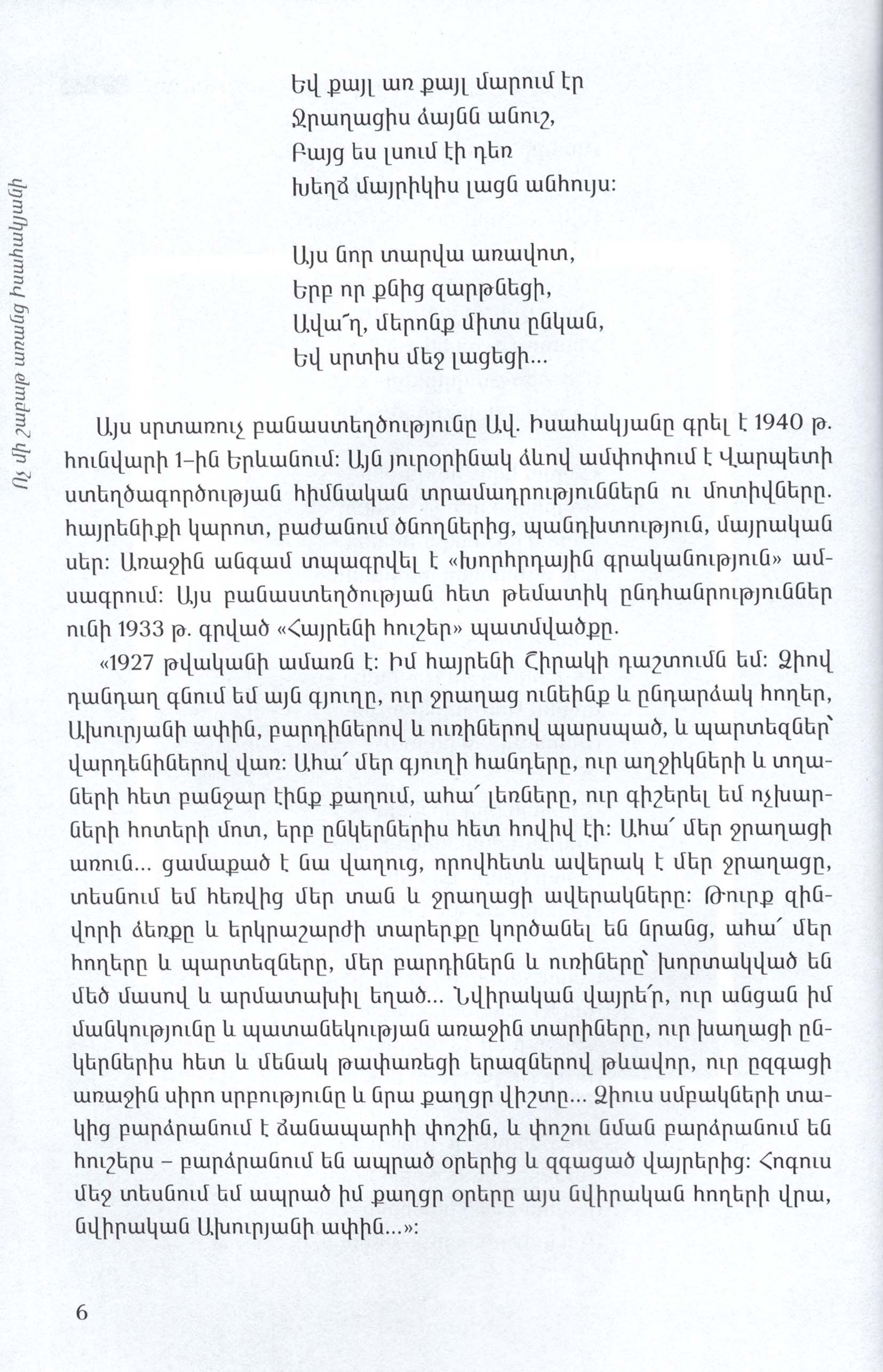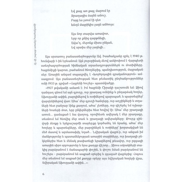 Ավետիք Իսահակյանի պոեզիան, ծնվելով ժողովրդական ակունքներից, անցնելով զարգացման մեծ ուղի, հարստանալով նոր գույներով ու ձևերով, հենց ժողովրդին է վերադարձնում այն լավագույնը, որն ունի ժողովուրդը։ Սակայն ժողովրդայնությունը Ավետիք Իսահակյանի բազմաժանր ստեղծագործութան միայն մեկ կողմն է։ Վարպետը ստեղծել է ընթերցողական ամենատարբեր ճաշակները բավարարող բազմազան ու տարբեր գործեր։ Փոքրածավալ քնարական բանաստեղծությունների կողքին հեղինակել է ծավալուն քնարական ու էպիկական պոեմներ, լեգենդներ ու բալլադներ, առակներ ու պատմվածքներ, վեպ, գրել հիանալի հուշեր։ Ավ. Իսահակյանի փոթորկուն կյանքի պատմությունն ինքնին մի մեծ վիպաշարի նյութ կարող է դառնալ։ Կյանքի վաղ տարիներից սկսյալ Ավ. Իսահակյանը իր ակտիվ գրական ու քաղաքական գործունեության համար ենթարկվել է հալածանքների, բանտարկվել ու աքսորվել, երկար տարիներ անցկացրել արտասահմանում, իր մասնակցությունը բերել ազգային-ազատագրական պայքարին, իր ստեղծագործություններով արտացոլել ու ոգեշնչել այդ պայքարը։ Նա մեծ հայանպաստ գործունեություն է ծավալել արտասահամանում, իսկ Հայաստան վերադարձից հետո ջանքեր չի խնայել հայրենիքի գրական-մշակութային կյանքի զարգացման համար։ Եվ նրան նվիրելով «Զանգակ» հրատարակչության «Ոչ մի շաբաթ առանց գրականության» նախագծի արդեն ութերորդ գիրքը, մենք փորձել ենք բանաստեղծի կյանքի ու ստեղծագործության ընտրված՝ տարվա շաբաթներին համապատասխան 52 անդրադարձ–դրվագներով ընդհանուր գծերով ներկայացնել մեծ բանաստեղծին, մտավորականին ու հայրենասեր հայ մարդուն, նաև մեր հարգանքի տուրքը մատուցել նրա հիշատակին։