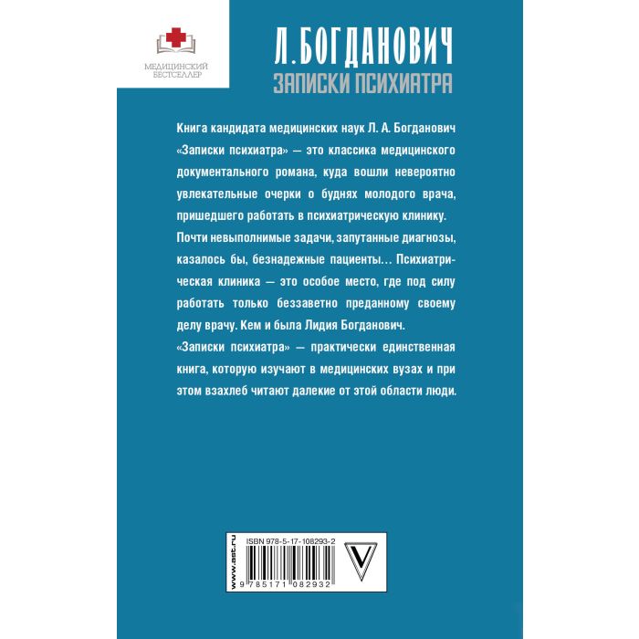 Книга кандидата медицинских наук Л. А. Богданович, "Записки психиатра" – это классика медицинского документального романа, куда вошли невероятно увлекательные очерки о буднях молодого врача пришедшего работать в психиатрическую клинику. Почти невыполнимые задачи, запутанные диагнозы, казалось бы безнадежные пациенты… Психиатрическая клиника – это особое место, где под силу работать только беззаветно преданному своему делу врачу. Кем и была Лидия Богданович. "Записки психиатра" - практически единственная книга, которую изучают в медицинских вузах, и при этом взахлеб читают далекие от этой области люди.