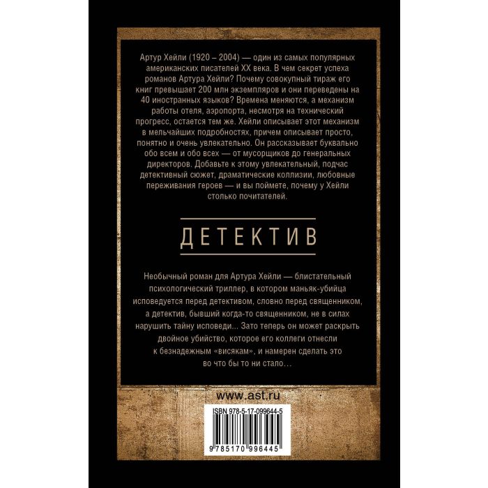 Необычный роман для Артура Хейли — блистательный психологический триллер, в котором маньяк-убийца исповедуется перед детективом, словно перед священником, а детектив, бывший когда-то священником, не в силах нарушить тайну исповеди... Зато теперь он может раскрыть двойное убийство, которое его коллеги отнесли к безнадежным "висякам", и намерен сделать это во что бы то ни стало…
