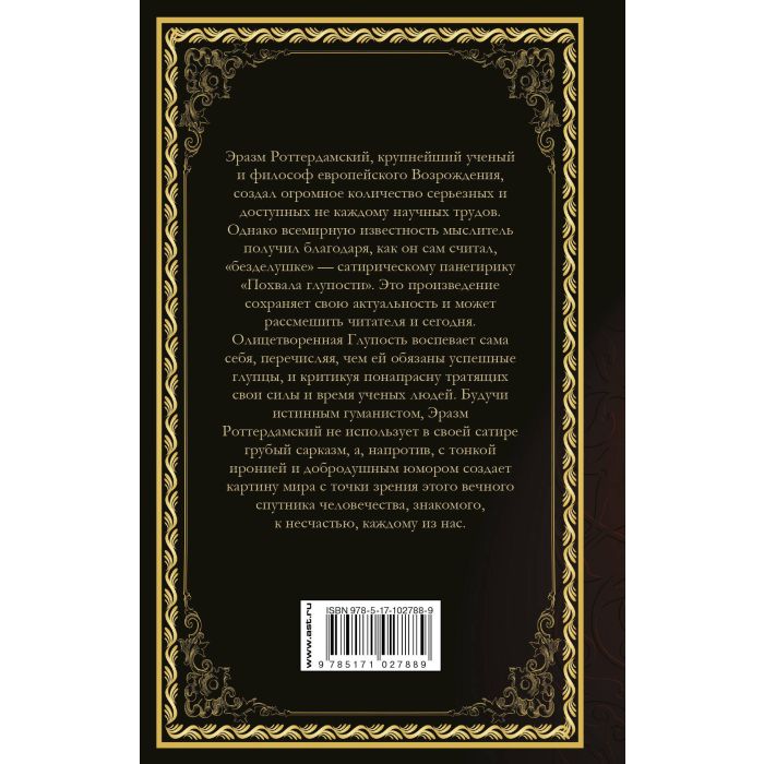 Эразм Роттердамский, крупнейший ученый и философ европейского Возрождения, создал огромное количество серьезных и доступных не каждому научных трудов. Однако всемирную известность мыслитель получил благодаря, как он сам считал, "безделушке" — сатирическому панегирику "Похвала глупости". Это произведение сохраняет свою актуальность и может рассмешить читателя и сегодня. Олицетворенная Глупость воспевает сама себя, перечисляя, чем ей обязаны успешные глупцы, и критикуя понапрасну тратящих свои силы и время ученых людей. Будучи истинным гуманистом, Эразм Роттердамский не использует в своей сатире грубый сарказм, а, напротив, с тонкой иронией и добродушным юмором создает картину мира с точки зрения этого вечного спутника человечества, знакомого, к несчастью, каждому из нас.