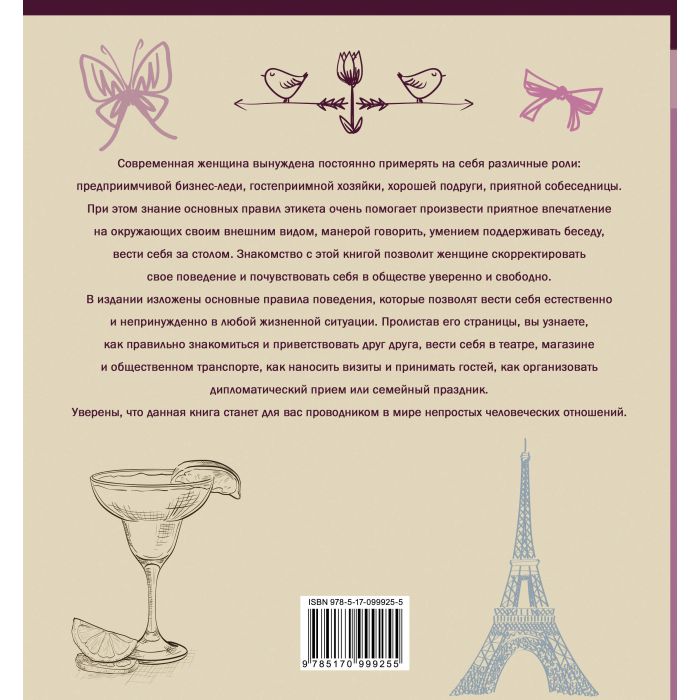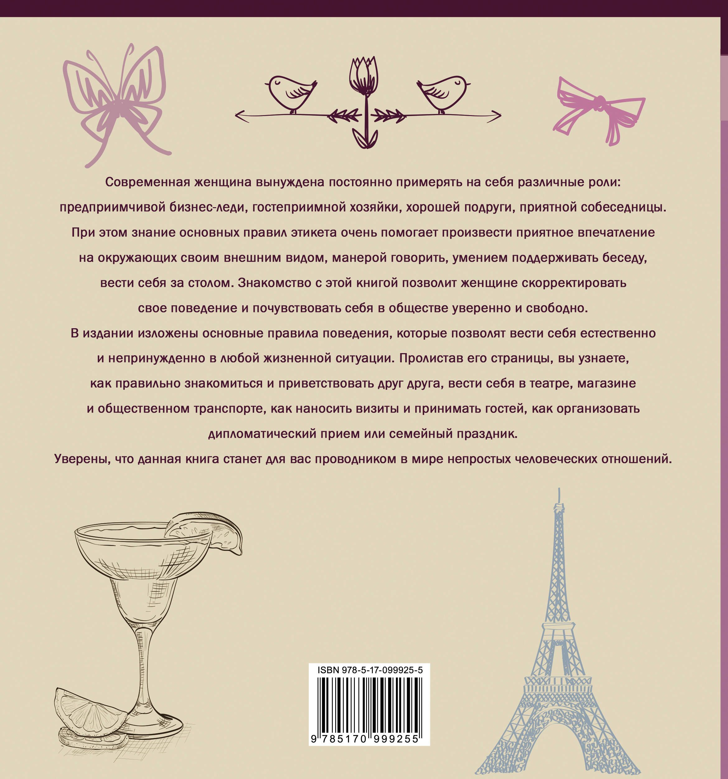 Современная женщина вынуждена постоянно примерять на себя различные роли: предприимчивой бизнес-леди, гостеприимной хозяйки, хорошей подруги, приятной собеседницы. А знание основных правил этикета очень помогает произвести приятное впечатление на окружающих своим внешним видом, манерой говорить, умением поддерживать беседу, вести себя за столом. Знакомство с этой книгой позволит женщине скорректировать свое поведение и почувствовать себя в обществе уверенно и свободно.