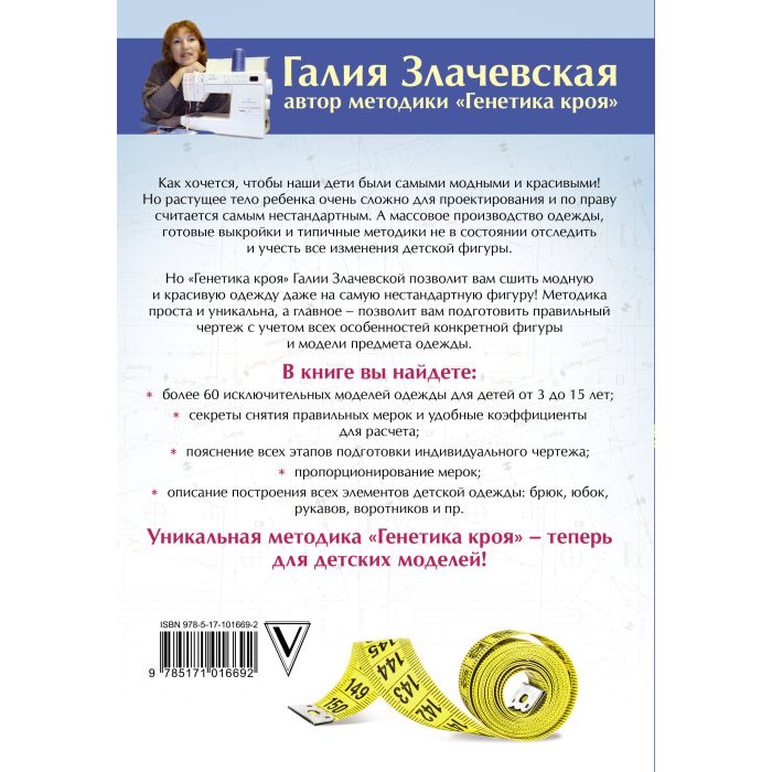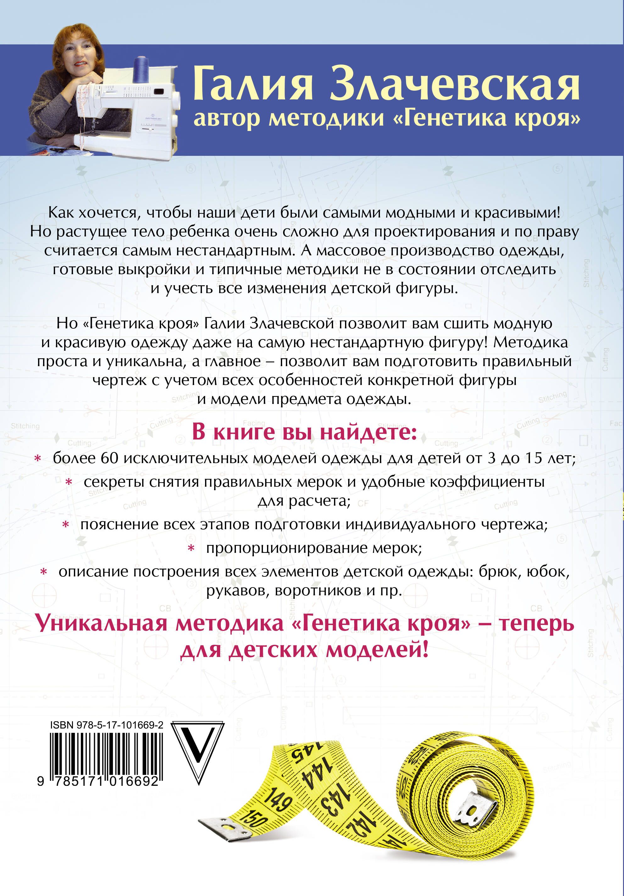 Как хочется, чтобы наши дети были самыми модными и красивыми! Но растущее тело ребенка очень сложно для проектирования и по праву считается самым нестандартным. А массовое производство одежды, готовые выкройки и типичные методики не в состоянии отследить и учесть все изменения детской фигуры. Но "Генетика кроя" Галии Злачевской позволит вам сшить модную и красивую одежду даже на самую нестандартную фигуру! Методика проста и уникальна, а главное – позволит вам подготовить правильный чертеж с учетом всех особенностей конкретной фигуры и модели предмета одежды. В книге вы найдете: – более 60 исключительных моделей одежды для детей от 3 до 15 лет; – секреты снятия правильных мерок и удобные коэффициенты для расчета; – пояснение всех этапов подготовки индивидуального чертежа; – пропорционирование мерок; – описание построения всех элементов детской одежды: брюк, юбок, рукавов, воротников и пр. Уникальная методика "Генетика кроя" – теперь для детских моделей!