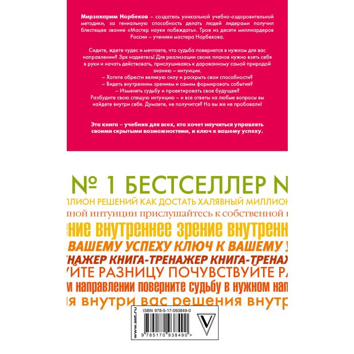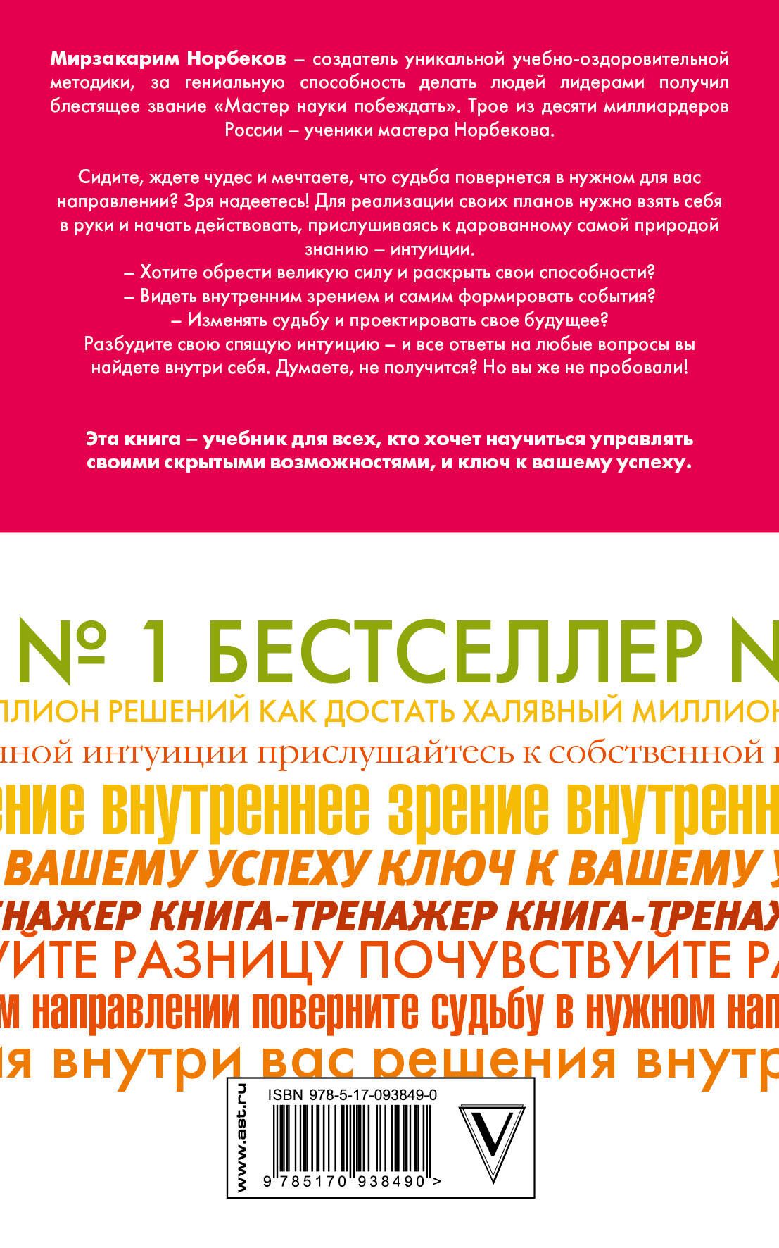 Мирзакарим Норбеков – создатель уникальной учебно-оздоровительной методики, за гениальную способность делать людей лидерами получил блестящее звание "Мастер науки побеждать". Трое из десяти миллиардеров России – ученики мастера Норбекова. Сидите, ждете чудес и мечтаете, что судьба повернется в нужном для вас направлении? Зря надеетесь! Для реализации своих планов нужно взять себя в руки и начать действовать, прислушиваясь к дарованному самой природой знанию – интуиции. – Хотите обрести великую силу и раскрыть свои способности? – Видеть внутренним зрением и самим формировать события? – Изменять судьбу и проектировать свое будущее? Разбудите свою спящую интуицию – и все ответы на любые вопросы вы найдете внутри себя. Думаете, не получится? Но вы же не пробовали! Эта книга – учебник для всех, кто хочет научиться управлять своими скрытыми возможностями, и ключ к вашему успеху.
