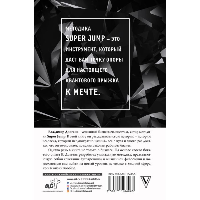 Владимир Довгань — успешный бизнесмен, писатель, автор методики Super Jump. В этой книге он рассказывает свою историю — историю человека, который неоднократно начинал все с нуля и много раз доказал, что он точно знает, по каким законам работает бизнес. Однако речь в книге не только о бизнесе. На основе своего богатого опыта В. Довгань разработал уникальную методику, представляющую собой сочетание аутотренинга и жизненной философии и позволяющую вам выйти на новый уровень не только в деловой сфере, но и в жизни вообще. Методика Super Jump — это инструмент, который даст вам точку опоры для настоящего квантового прыжка к мечте.