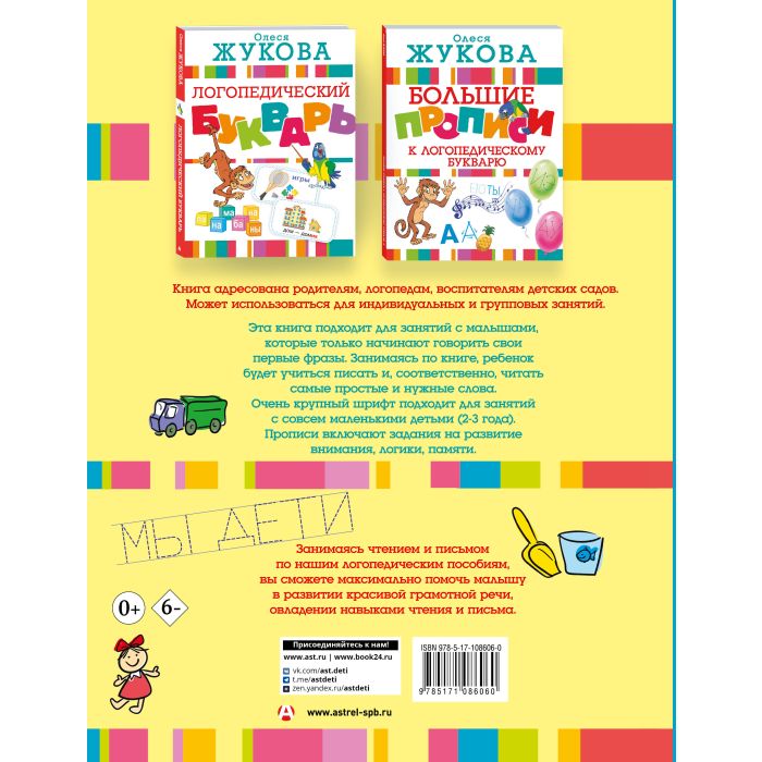 Эта книга подходит для занятий с малышами, которые только начинают говорить свои первые фразы. Занимаясь по книге, ребенок будет учиться писать и, соответственно, читать самые простые и нужные слова. Очень крупный шрифт подходит для занятий с совсем маленькими детьми. Прописи включают задания на развитие внимания, логики, памяти. Для детей до 3 лет.