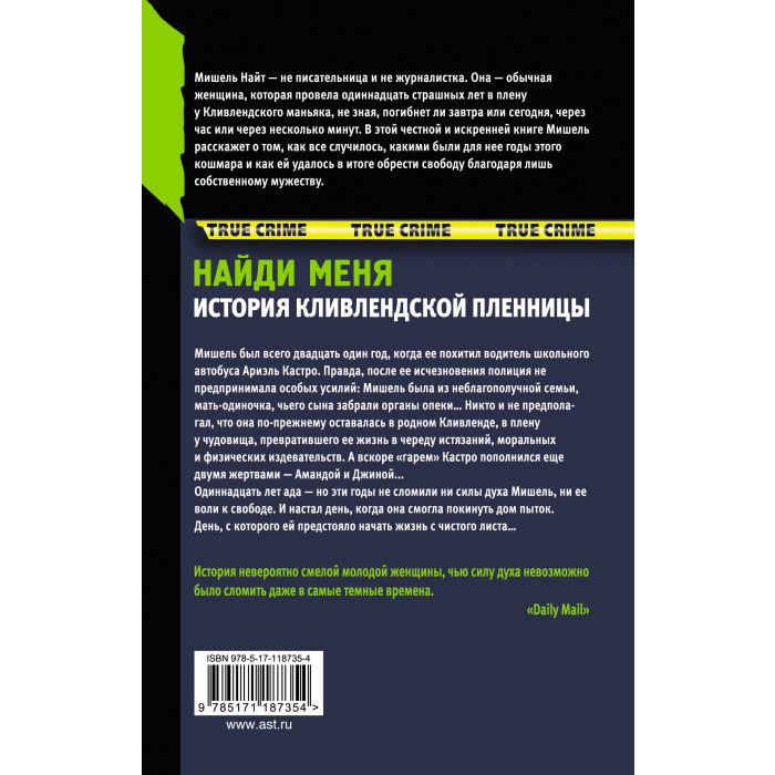 Мишель был всего двадцать один год, когда ее похитил водитель школьного автобуса Ариэль Кастро. Правда, после ее исчезновения полиция не предпринимала особых усилий: Мишель была из неблагополучной семьи, мать-одиночка, чьего сына забрали органы опеки… Никто и не предполагал, что она по-прежнему оставалась в родном Кливленде, в плену у чудовища, превратившего ее жизнь в череду истязаний, моральных и физических издевательств. А вскоре "гарем" Кастро пополнился еще двумя жертвами — Амандой и Джиной... Одиннадцать лет ада — но эти годы не сломили ни силы духа Мишель, ни ее воли к свободе. И настал день, когда она смогла покинуть дом пыток. День, с которого ей предстояло начать жизнь с чистого листа…