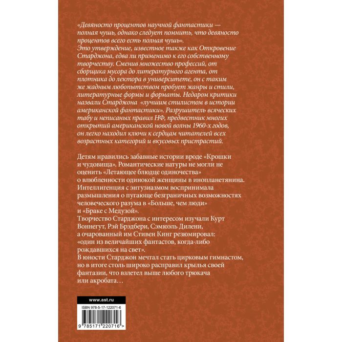 "Девяносто процентов научной фантастики — полная чушь, однако следует помнить, что девяносто процентов всего есть полная чушь". Это утверждение, известное также как Откровение Старджона, едва ли применимо к его собственному творчеству. Сменив множество профессий, от сборщика мусора до литературного агента, от плотника до лектора в университете, он с таким же жадным любопытством пробует жанры и стили, литературные формы и форматы. Недаром критики назвали Старджона "лучшим стилистом в истории американской фантастики". Разрушитель всяческих табу и неписаных правил НФ, предвестник многих открытий американской новой волны 1960-х годов, он легко находил ключи к сердцам читателей всех возрастных категорий и вкусовых пристрастий. Детям нравились забавные истории вроде "Крошки и чудовища". Романтические натуры не могли не оценить "Летающее блюдце одиночества" о влюбленности одинокой женщины в инопланетянина. Интеллигенция с энтузиазмом воспринимала размышления о пугающе безграничных возможностях человеческого разума в "Больше, чем люди" и "Браке с Медузой". Творчество Старджона с интересом изучали Курт Воннегут, Рэй Брэдбери, Cэмюэль Дилени, а очарованный им Стивен Кинг резюмировал: "Один из величайших фантастов, когда-либо рождавшихся на свет". В юности Старджон мечтал стать цирковым гимнастом, но в итоге столь широко расправил крылья своей фантазии, что взлетел выше любого трюкача или акробата…