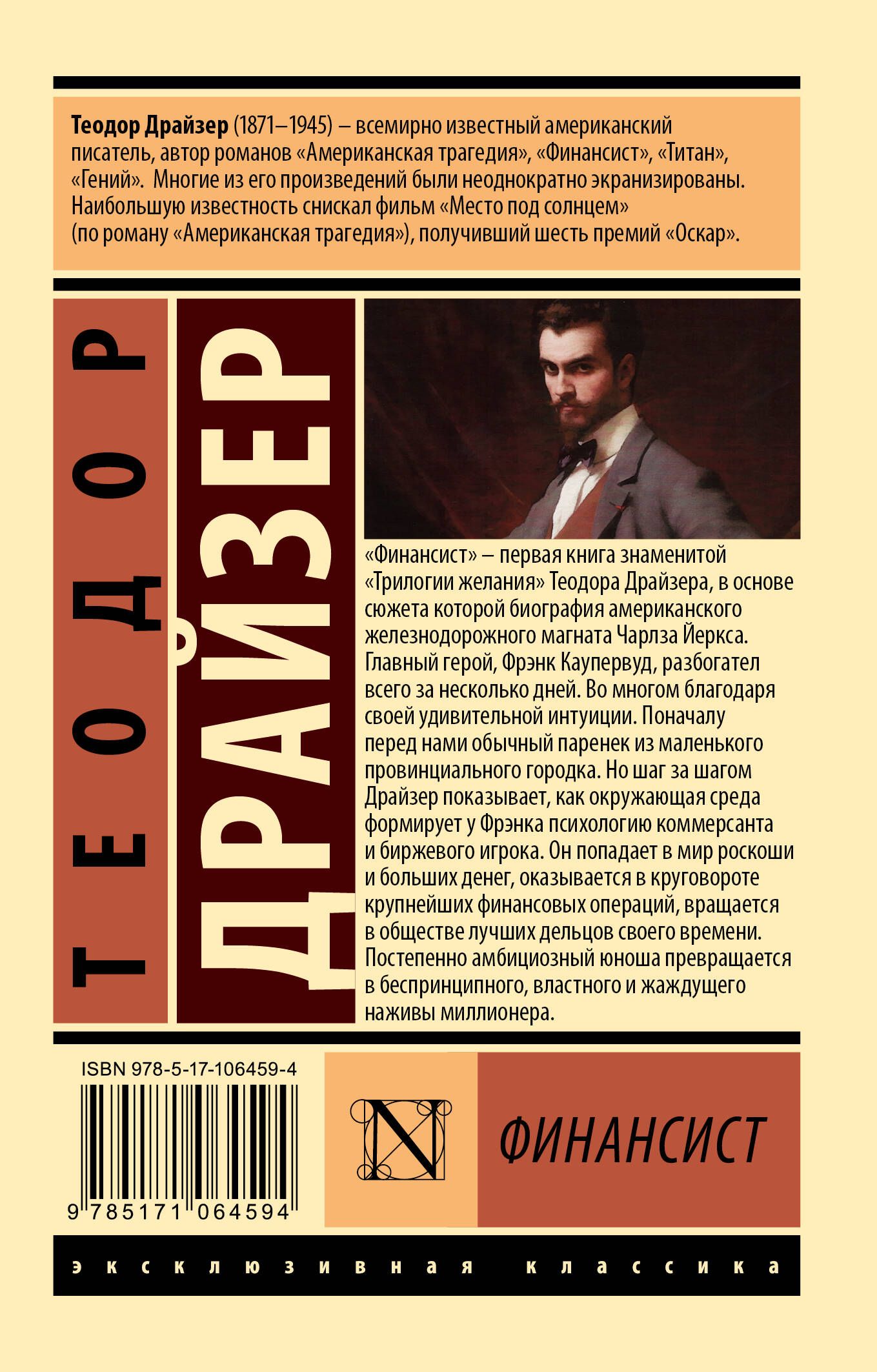 "Финансист" – первая книга знаменитой "Трилогии желания" Теодора Драйзера, в основе сюжета которой биография американского железнодорожного магната Чарлза Йеркса. Главный герой, Фрэнк Каупервуд, разбогател всего за несколько дней. Во многом благодаря своей удивительной интуиции. Поначалу перед нами обычный паренек из маленького провинциального городка. Но шаг за шагом Драйзер показывает, как окружающая среда формирует у Фрэнка психологию коммерсанта и биржевого игрока. Он попадает в мир роскоши и больших денег, оказывается в круговороте крупнейших финансовых операций, вращается в обществе лучших дельцов своего времени. Постепенно амбициозный юноша превращается в беспринципного, властного и жаждущего наживы миллионера.