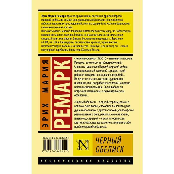 "Черный обелиск" (1956 г.) – знаменитый роман Ремарка, во многом автобиографичный.