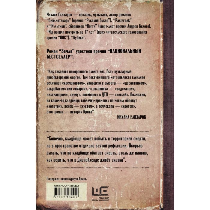 Михаил Елизаров — автор романов “Библиотекарь” (премия “Русский Букер"), “Pasternak” и “Мультики” (шорт-лист премии “Национальный бестселлер”), сборников рассказов “Ногти” (шорт-лист премии Андрея Белого), “Мы вышли покурить на 17 лет” (приз читательского голосования премии “НОС”). Новый роман Михаила Елизарова “Земля” — первое масштабное осмысление “русского танатоса”. “Как такового похоронного сленга нет. Есть вульгарный прозекторский жаргон. Там поступившего мотоциклиста глумливо величают "космонавтом", упавшего с высоты — "десантником", "акробатом" или "икаром", утопленника — "водолазом", "ихтиандром", "муму", погибшего в ДТП — "кеглей". Возможно, на каком-то кладбище табличку-времянку на могилу обзовут "лопатой", венок — "кустом", а землекопа — "кротом". Этот роман — история Крота” (Михаил Елизаров). Роман удостоен премии "Национальный бестселлер".