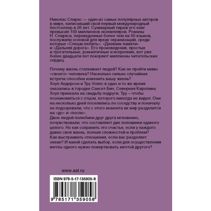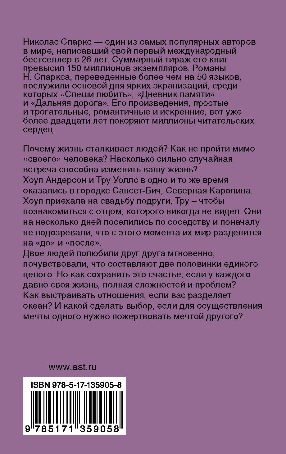 Хоуп Андерсон и Тру Уоллс в одно и то же время оказались в городке Сансет-Бич, Северная Каролина. Хоуп приехала на свадьбу подруги, Тру – чтобы познакомиться с отцом, которого никогда не видел. Они на несколько дней поселились по соседству и поначалу не подозревали, что с этого момента их мир разделится на "до" и "после".