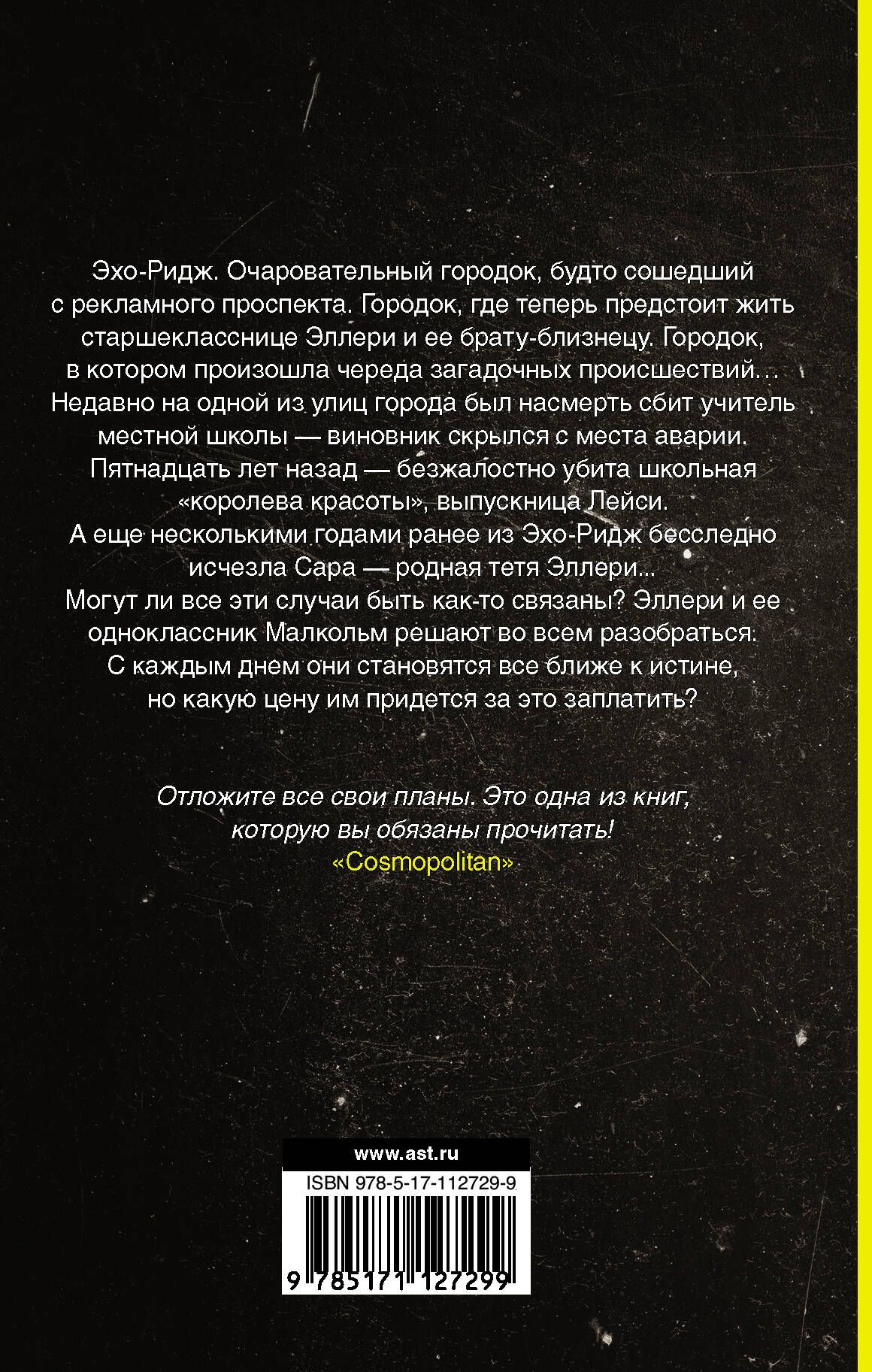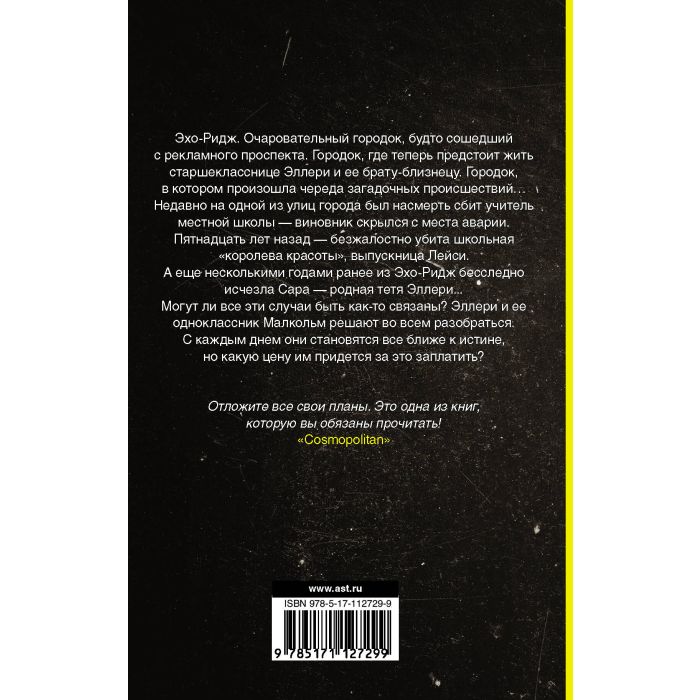 Эхо-Ридж. Очаровательный городок, будто сошедший с рекламного проспекта. Городок, где теперь предстоит жить старшекласснице Эллери и ее брату-близнецу. Городок, в котором произошла череда загадочных происшествий… Недавно на одной из улиц города был насмерть сбит учитель местной школы — виновник скрылся с места аварии. Пятнадцать лет назад — безжалостно убита школьная "королева красоты", выпускница Лейси… А еще несколькими годами ранее из Эхо-Ридж бесследно исчезла Сара — родная тетя Эллери. Могут ли все эти случаи быть как-то связаны? Эллери и ее одноклассник Малкольм решают во всем разобраться. С каждым днем они становятся все ближе к истине, но какую цену им придется за это заплатить?