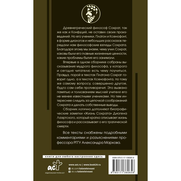 Впервые в одном сборнике собраны высказывания мудрого философа, у которого и сегодня читателю есть чему поучиться. Правда, порой в текстах Платона Сократ говорит одно, а в текстах Ксенофонта, по тому же самому вопросу, совершенно другое, будто сам себе противоречит. Это вызвано памятью и толкованием мыслей учителя его не менее известными учениками. Но тем интереснее следить за цепочкой соображений Сократа и делать собственные выводы.