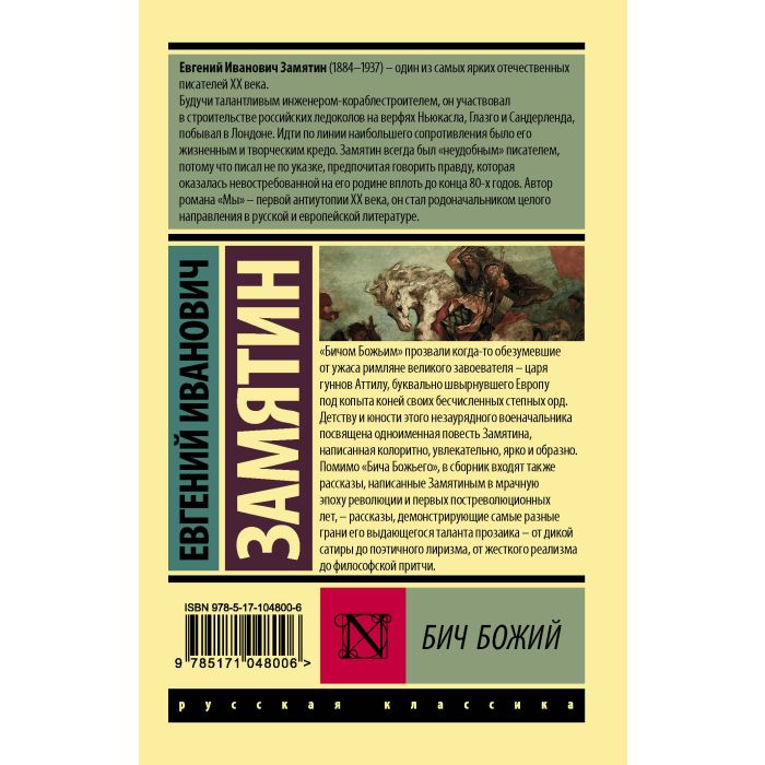 "Бичом Божьим" прозвали когда-то обезумевшие от ужаса римляне великого завоевателя — царя гуннов Аттилу, буквально швырнувшего Европу под копыта коней своих бесчисленных степных орд. Детству и юности этого незаурядного военачальника посвящена одноименная повесть Замятина, написанная колоритно, увлекательно, ярко и образно. Помимо "Бича Божьего", в сборник входят также рассказы, написанные Замятиным в мрачную эпоху революции и первых постреволюционных лет, — рассказы, демонстрирующие самые разные грани его выдающегося таланта прозаика, — от дикой сатиры до поэтичного лиризма, от жесткого реализма до философской притчи.