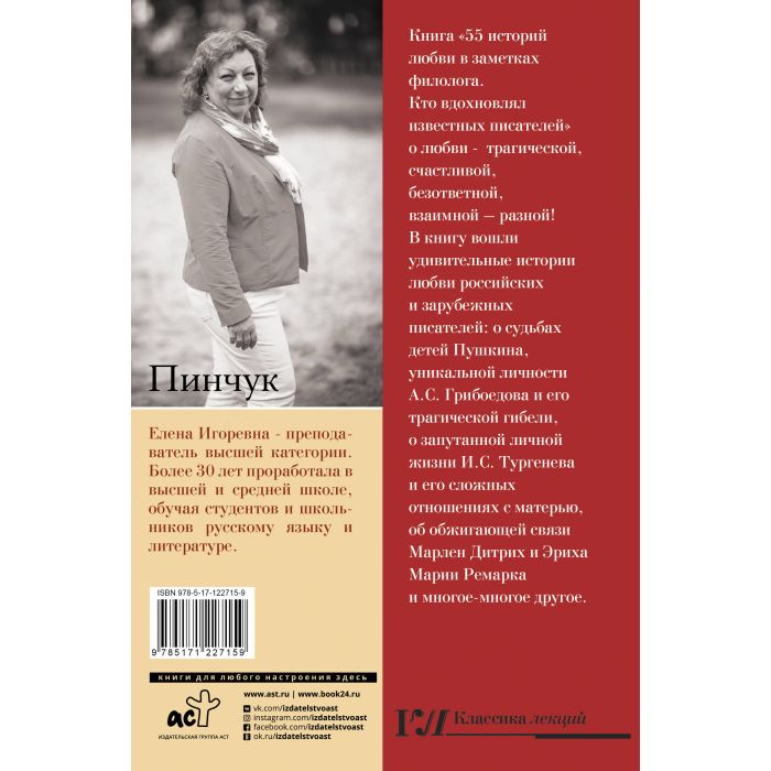 Книга "55 историй любви в заметках филолога. Кто вдохновлял известных писателей" о любви - трагической, счастливой, безответной, взаимной - разной! В книгу вошли удивительные истории любви российских и зарубежных писателей: о судьбах детей Пушкина, уникальной личности А.С. Грибоедова и его трагической гибели, о запутанной личной жизни И.С. Тургенева и его сложных отношениях с матерью, об обжигающей связи Марлен Дитрих и Эриха Марии Ремарка и многое-многое другое.