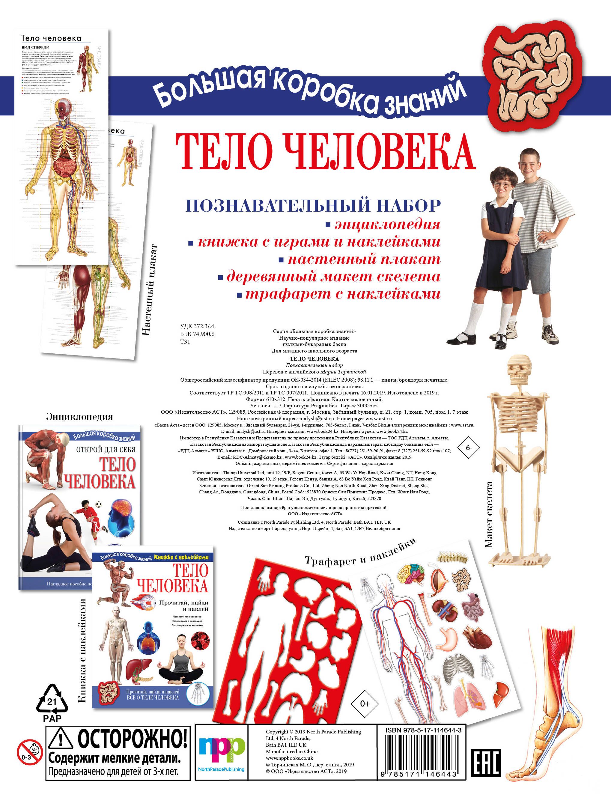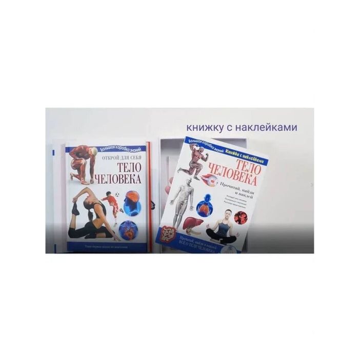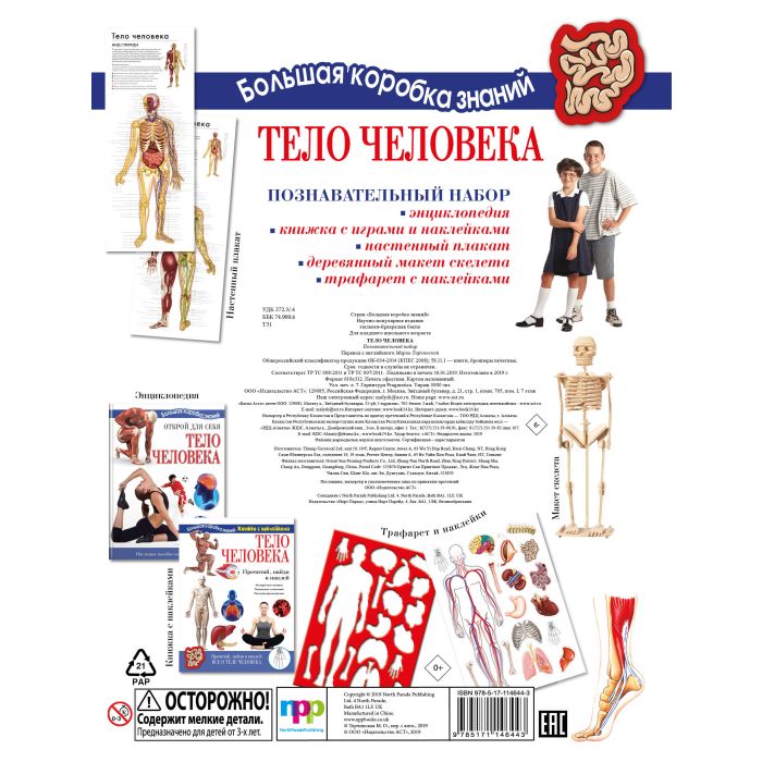 Наша Большая коробка знаний полным-полна. Чего в ней только нет! Энциклопедия с интересными сведениями о теле человека, книжка с увлекательными играми и яркими наклейками, набор для сборки — деревянный макет скелета, большой настенный плакат и полезный трафарет с наклейками. Уверены, что дети по достоинству оценят нашу "Большую коробку знаний"! Учись с нами, и ты узнаешь, как устроено тело человека!