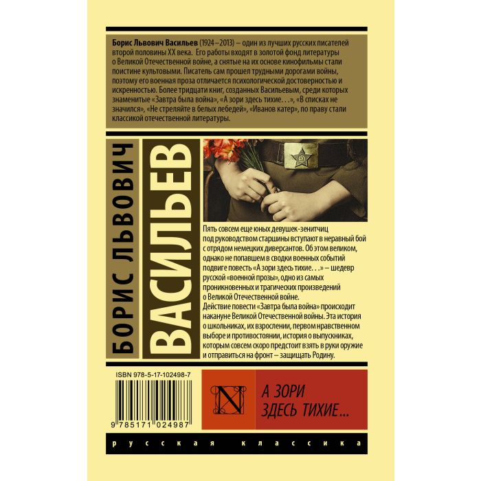 Пять совсем еще юных девушек-зенитчиц под руководством старшины вступают в неравный бой с отрядом немецких диверсантов. Об этом великом, однако не попавшем в сводки военных событий подвиге повесть "А зори здесь тихие…" – шедевр русской "военной прозы", одно из самых проникновенных и трагических произведений о Великой Отечественной войне.
