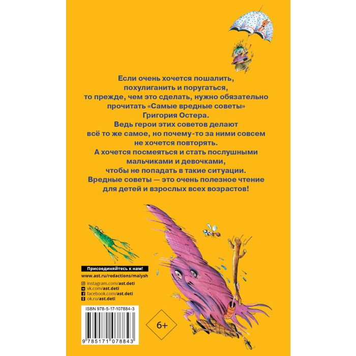 Если очень хочется пошалить, похулиганить и поругаться, то прежде, чем это сделать, нужно обязательно прочитать "Самые вредные советы" Григория Остера. Ведь герои этих советов делают всё то же самое, но почему-то за ними совсем не хочется повторять. А хочется посмеяться и стать послушными мальчиками и девочками, чтобы не попадать в такие ситуации. Вредные советы - это очень полезное чтение для детей и взрослых всех возрастов!