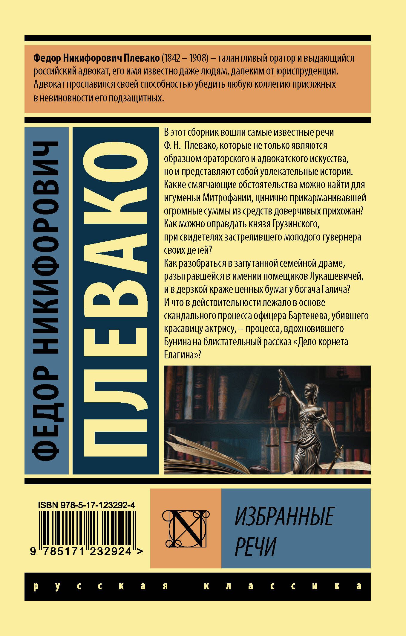 Федор Никифорович Плевако (1842 – 1908) – талантливый оратор и выдающийся российский адвокат, его имя известно даже людям, далеким от юриспруденции. Адвокат прославился своей способностью убедить любую коллегию присяжных в невиновности его подзащитных. В этот сборник вошли самые известные речи Ф. Н. Плевако, которые не только являются образцом ораторского и адвокатского искусства, но и представляют собой увлекательные истории. Какие смягчающие обстоятельства можно найти для игуменьи Митрофании, цинично прикарманивавшей огромные суммы из средств доверчивых прихожан? Как можно оправдать князя Грузинского, при свидетелях застрелившего молодого гувернера своих детей? Как разобраться в запутанной семейной драме, разыгравшейся в имении помещиков Лукашевичей, и в дерзкой краже ценных бумаг у богача Галича? И что в действительности лежало в основе скандального процесса офицера Бартенева, убившего красавицу актрису, – процесса, вдохновившего Бунина на блистательный рассказ "Дело корнета Елагина"?
