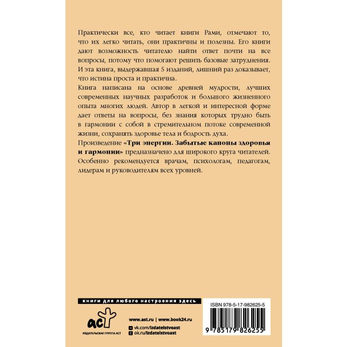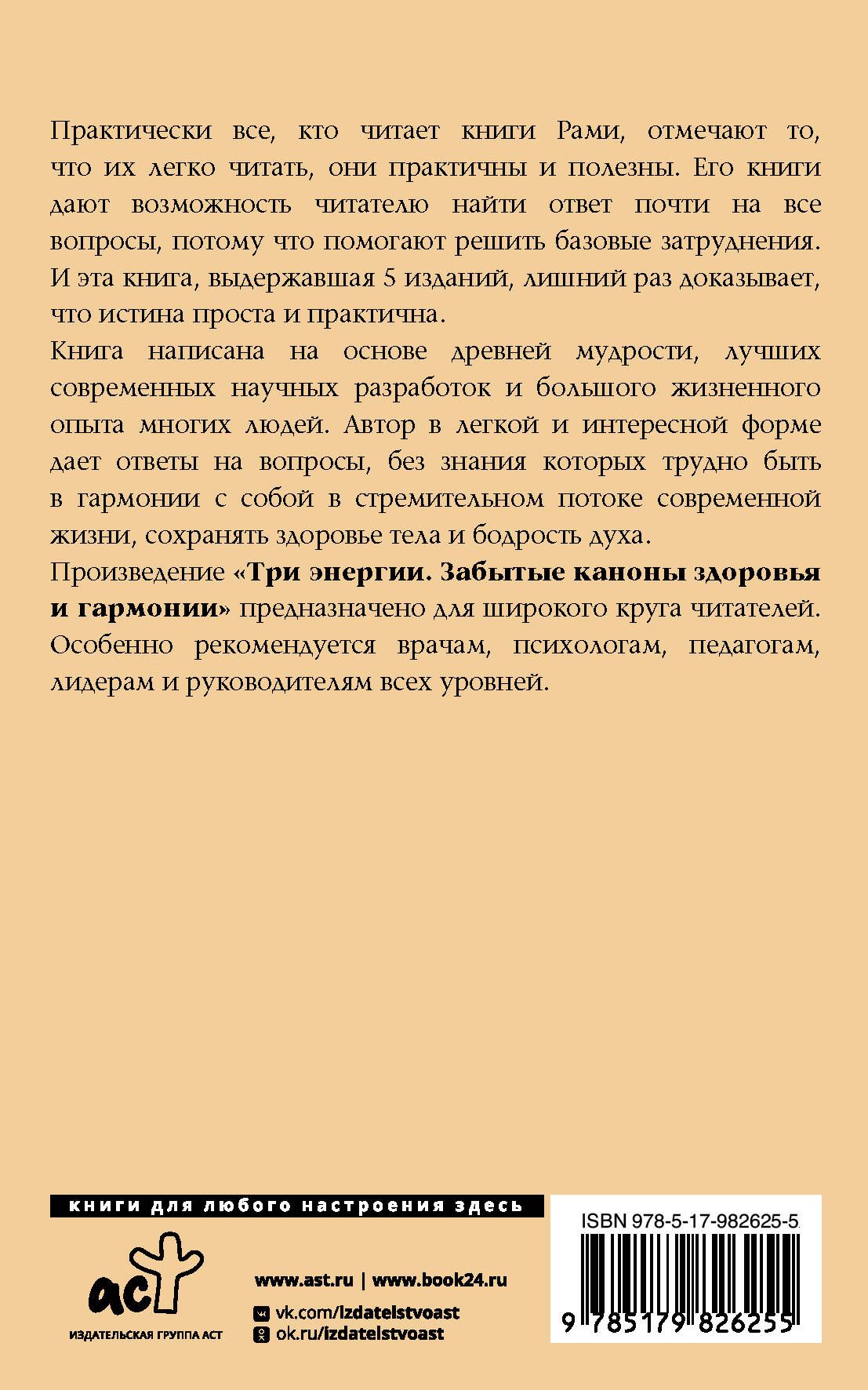 Практически все, кто читает книги Рами, отмечают, что их легко читать, они практичны и полезны. Его книги дают возможность читателю найти ответ почти на все вопросы, потому что помогают решить базовые затруднения. И эта книга, выдержавшая 5 изданий, лишний раз доказывает, что истина проста и практична. Книга написана на основе древней мудрости, лучших современных научных разработок и большого жизненного опыта многих людей. Автор в легкой и интересной форме дает ответы на вопросы, без знания которых трудно быть в гармонии с собой в стремительном потоке современной жизни, сохранять здоровье тела и бодрость духа. Произведение "Три энергии. Забытые каноны здоровья и гармонии" предназначено для широкого круга читателей. Особенно рекомендуется врачам, психологам, педагогам, лидерам и руководителям всех уровней.