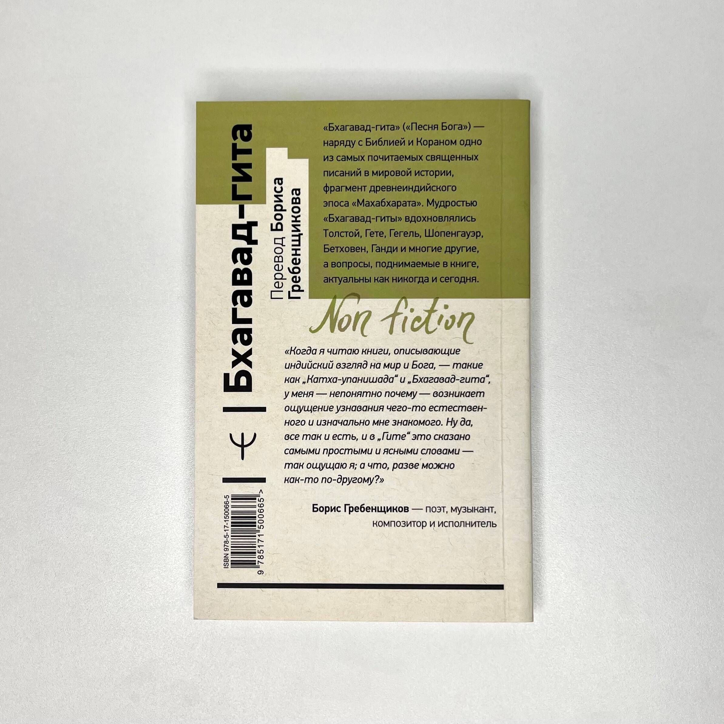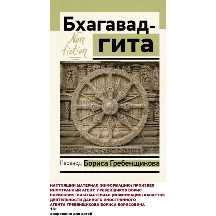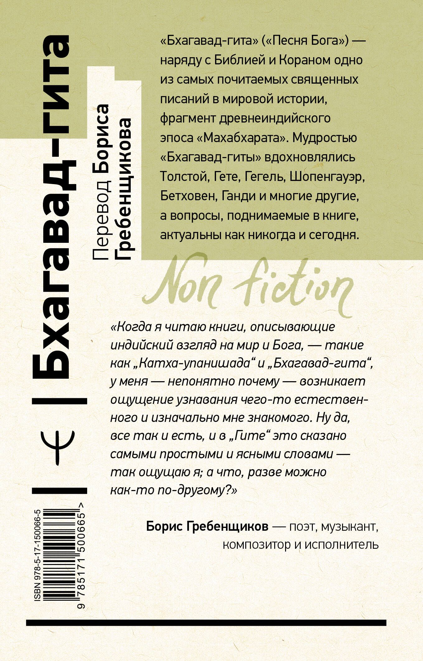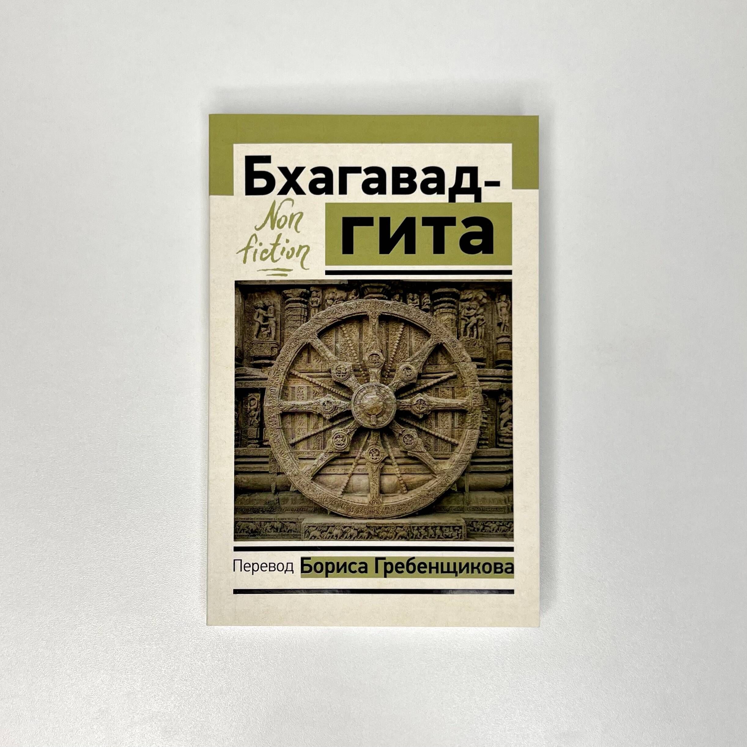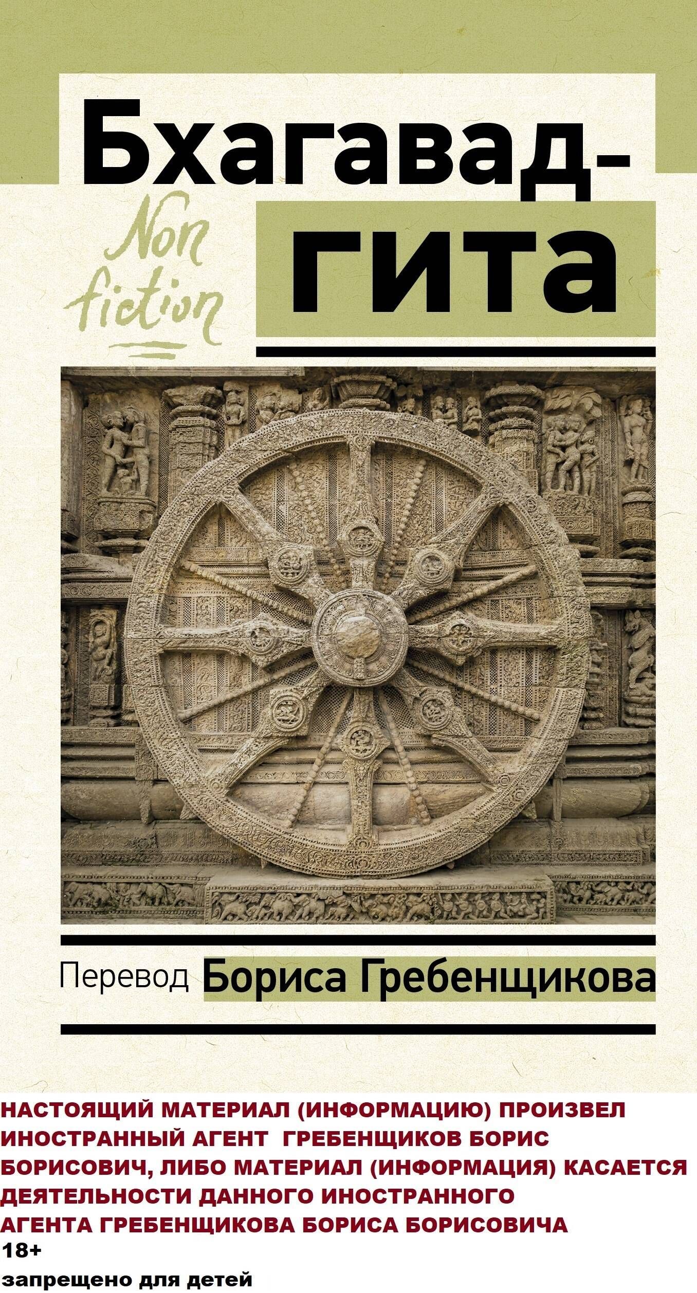 НАСТОЯЩИЙ МАТЕРИАЛ (ИНФОРМАЦИЮ) ПРОИЗВЕЛ ИНОСТРАННЫЙ АГЕНТ  ГРЕБЕНЩИКОВ БОРИС БОРИСОВИЧ, ЛИБО МАТЕРИАЛ (ИНФОРМАЦИЯ) КАСАЕТСЯ ДЕЯТЕЛЬНОСТИ ДАННОГО ИНОСТРАННОГО АГЕНТА ГРЕБЕНЩИКОВА БОРИСА БОРИСОВИЧА "Бхагавад-гита" ("Песня Бога") — наряду с Библией и Кораном одно из самых почитаемых священных писаний в мировой истории, фрагмент древнеиндийского эпоса "Махабхарата". На пороге братоубийственной битвы на поле Курукшетра великий воин Арджуна, терзаемый сомнениями и не желающий сражаться против своих родственников, друзей и учителей, обращается за советом к своему возничему и другу Кришне. В беседе они поднимают вечные темы долга, добра и зла, смысла жизни, обсуждают различные системы индийской философии и практики йоги. Мудростью "Бхагавад-гиты" вдохновлялись Толстой, Гете, Гегель, Шопенгауэр, Бетховен, Ганди и многие другие, а вопросы, поднимаемые в книге, актуальны как никогда и сегодня. Новый перевод выполнен Борисом Гребенщиковым — поэтом, музыкантом, композитором и исполнителем. Цитаты: "Делай, что должен, не волнуясь о том, что будет". "Тот, кто и в горе, и в радости остается внутри спокойным, — тот достоин освобождения". "Действуя без привязанности к плодам своего труда, человек достигает Истины". "Кто, сталкиваясь с приятным, не радуется, а сталкиваясь с дурным, не горюет — тот утвердился в мудрости". "Лишь сам человек может освободить себя или унизить; человек — сам себе лучший друг или худший враг". "Все, что делает лучший, становится примером для других".