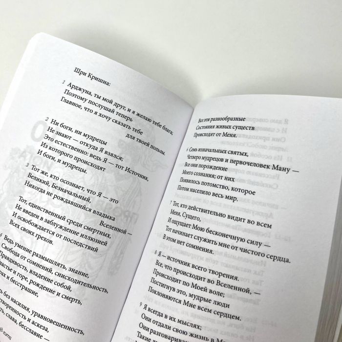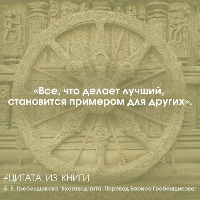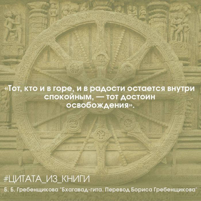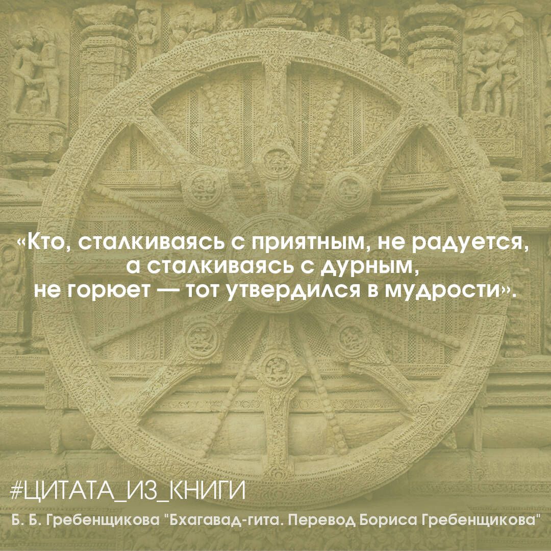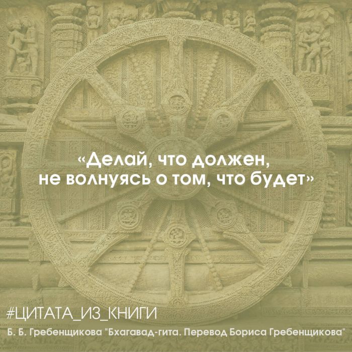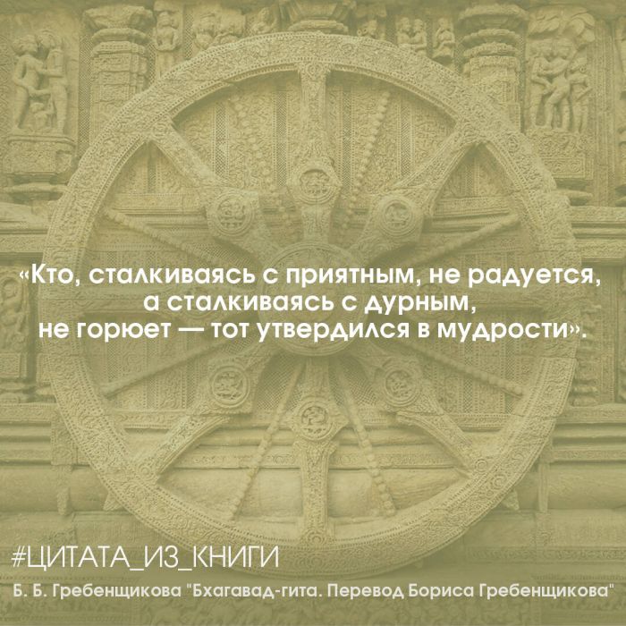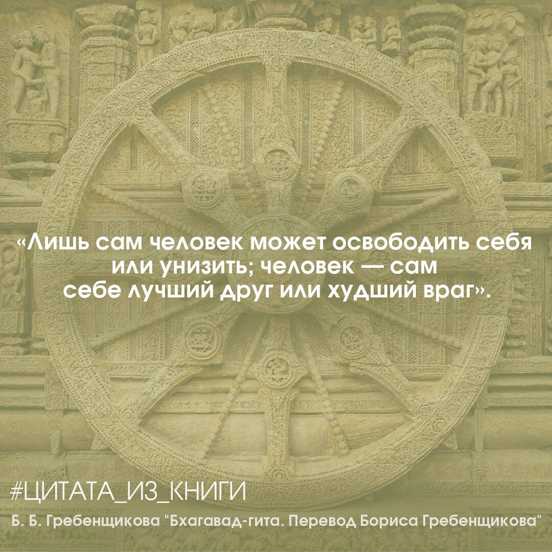 НАСТОЯЩИЙ МАТЕРИАЛ (ИНФОРМАЦИЮ) ПРОИЗВЕЛ ИНОСТРАННЫЙ АГЕНТ  ГРЕБЕНЩИКОВ БОРИС БОРИСОВИЧ, ЛИБО МАТЕРИАЛ (ИНФОРМАЦИЯ) КАСАЕТСЯ ДЕЯТЕЛЬНОСТИ ДАННОГО ИНОСТРАННОГО АГЕНТА ГРЕБЕНЩИКОВА БОРИСА БОРИСОВИЧА "Бхагавад-гита" ("Песня Бога") — наряду с Библией и Кораном одно из самых почитаемых священных писаний в мировой истории, фрагмент древнеиндийского эпоса "Махабхарата". На пороге братоубийственной битвы на поле Курукшетра великий воин Арджуна, терзаемый сомнениями и не желающий сражаться против своих родственников, друзей и учителей, обращается за советом к своему возничему и другу Кришне. В беседе они поднимают вечные темы долга, добра и зла, смысла жизни, обсуждают различные системы индийской философии и практики йоги. Мудростью "Бхагавад-гиты" вдохновлялись Толстой, Гете, Гегель, Шопенгауэр, Бетховен, Ганди и многие другие, а вопросы, поднимаемые в книге, актуальны как никогда и сегодня. Новый перевод выполнен Борисом Гребенщиковым — поэтом, музыкантом, композитором и исполнителем. Цитаты: "Делай, что должен, не волнуясь о том, что будет". "Тот, кто и в горе, и в радости остается внутри спокойным, — тот достоин освобождения". "Действуя без привязанности к плодам своего труда, человек достигает Истины". "Кто, сталкиваясь с приятным, не радуется, а сталкиваясь с дурным, не горюет — тот утвердился в мудрости". "Лишь сам человек может освободить себя или унизить; человек — сам себе лучший друг или худший враг". "Все, что делает лучший, становится примером для других".