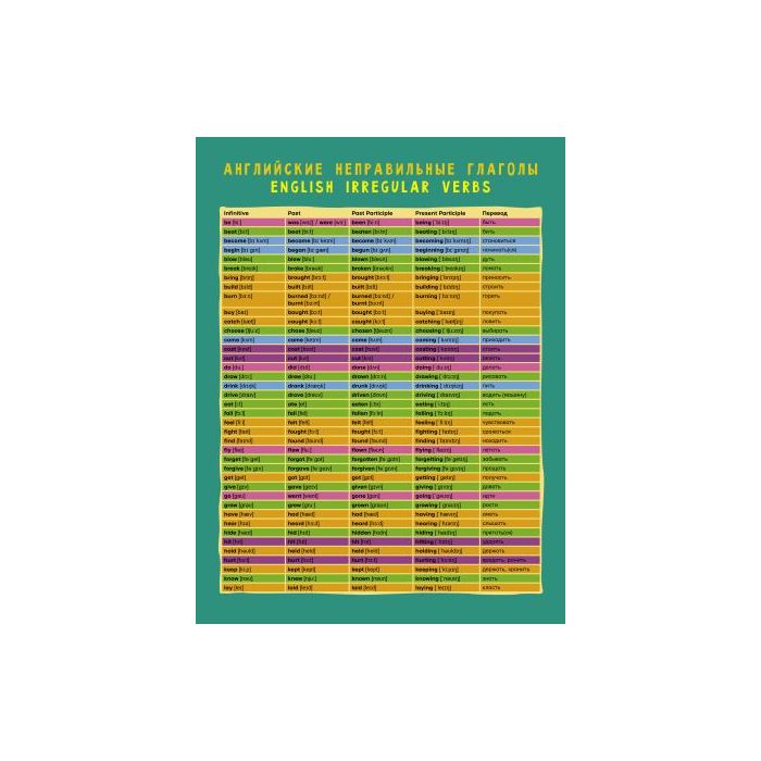 Плакат-подсказка "Английские неправильные глаголы" – незаменимый помощник в изучении английского языка. В таблице представлены 80 самых употребительных неправильных глаголов. К каждому глаголу даются три формы, а также ing-форма и перевод. Все формы глаголов снабжены международной фонетической транскрипцией. Глаголы с похожим способом образования форм выделены одинаковыми цветами.