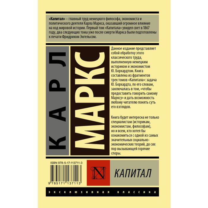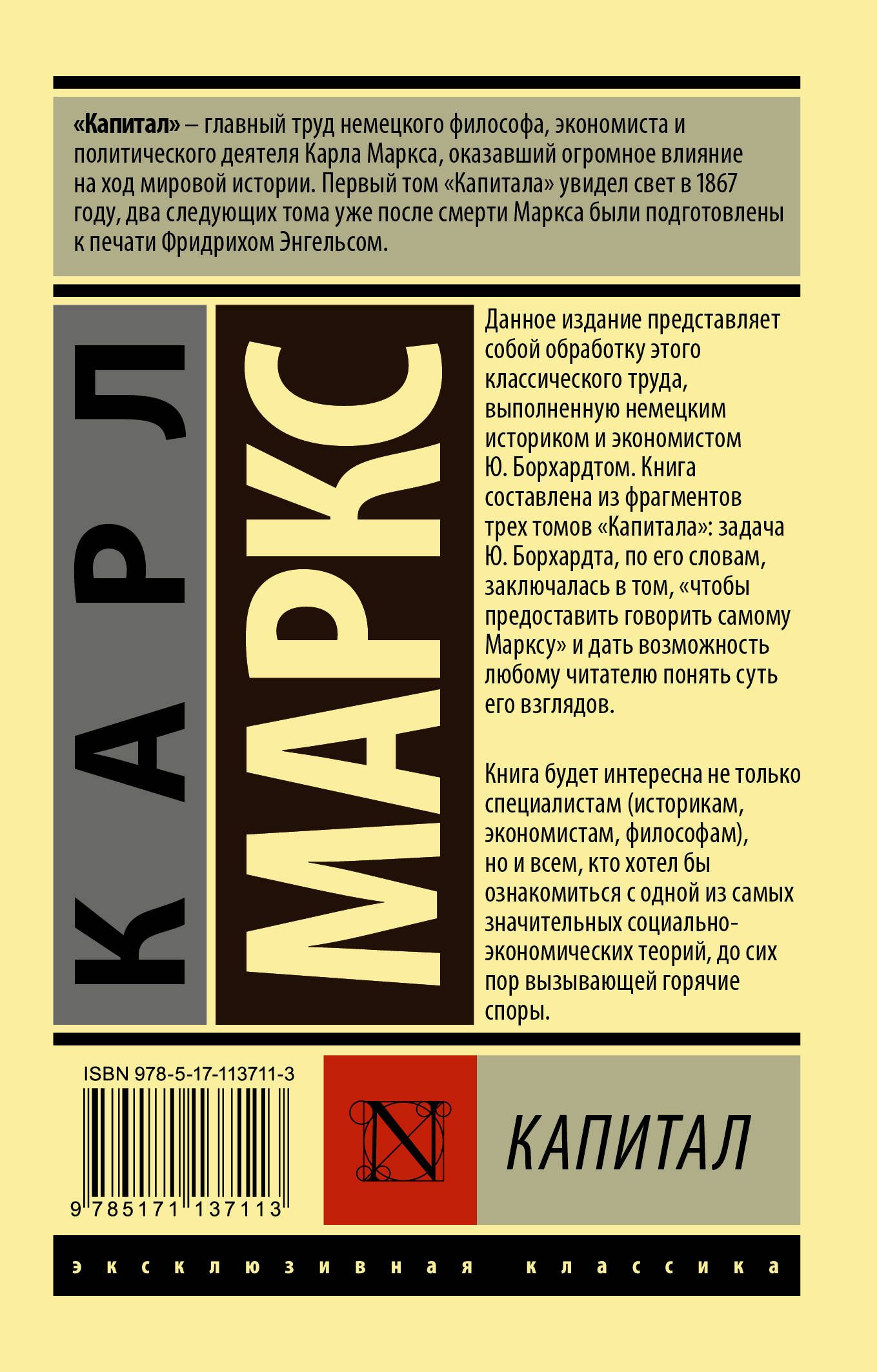 "Капитал" — главный труд немецкого философа, экономиста и политического деятеля Карла Маркса, оказавший огромное влияние на ход мировой истории. Первый том "Капитала" увидел свет в 1867 году, два следующих тома уже после смерти Маркса были подготовлены к печати Фридрихом Энгельсом. Данное издание представляет собой обработку этого классического труда, выполненную немецким историком и экономистом Ю. Борхардтом. Книга составлена из фрагментов трех томов "Капитала": задача Ю. Борхардта, по его словам, заключалась в том, "чтобы предоставить говорить самому Марксу" и дать возможность любому читателю понять суть его взглядов. Книга будет интересна не только специалистам (историкам, экономистам, философам), но и всем, кто хотел бы ознакомиться с одной из самых значительных социально-экономических теорий, до сих пор вызывающей горячие споры.