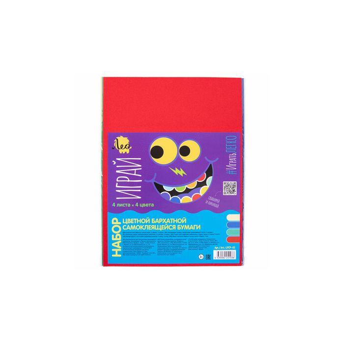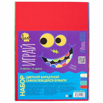 Бумага самоклеящаяся цветная, бархатная Лео Играй 4л 4цв.